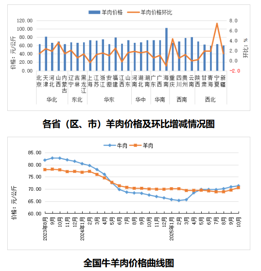 全国羊肉平均价格70.60元/公斤,同比涨0.8%,环比涨1.5%。河北、内蒙古、山东、河南和新疆等主产省份羊肉平均价格68.17元/公斤,同比涨6.3%,环比涨1.3%。从涨跌情况看,西北地区环比涨幅较大,宁夏领涨,涨幅为7.4%。