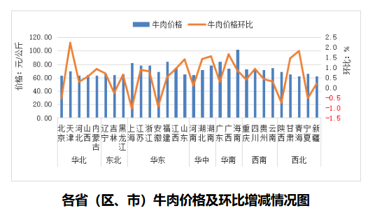 全国牛肉平均价格71.31元/公斤,同比涨5.6%,环比涨0.6%。河北、辽宁、吉林、山东和河南等主产省份牛肉平均价格为65.37元/公斤,同比涨16.7%,环比涨0.4%。从涨跌情况看,华中地区环比涨幅较大,湖南领涨,涨幅为1.6%。