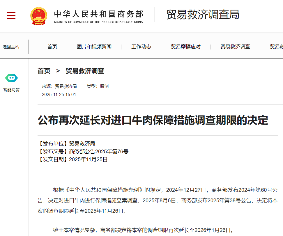根据《中华人民共和国保障措施条例》的规定,2024年12月27日,商务部发布2024年第60号公告,决定对进口牛肉进行保障措施立案调查。2025年8月6日,商务部发布2025年第38号公告,决定将本案的调查期限延长至2025年11月26日。