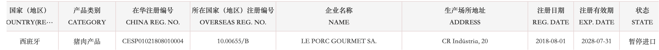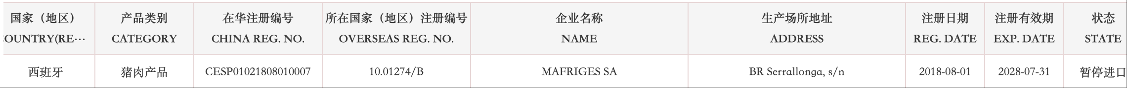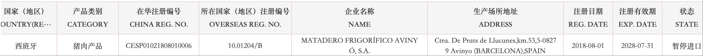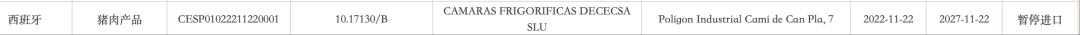 暂停受理西班牙12家猪肉企业(注册编码为:10.00655/B、10.01204/B、10.01274/B、10.03924/B、10.07986/B、10.08166/B、10.01293/B、10.04472/B、10.08224/B、10.01184/B、10.17130/B、10.17391/B、)自2025年11月28日(含)起启运的输华产品进口申报。