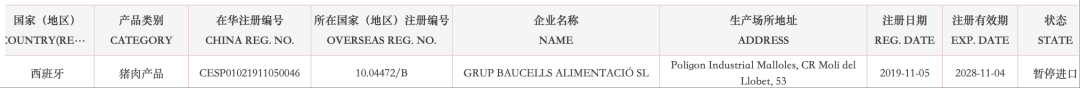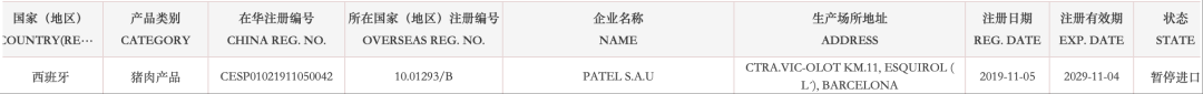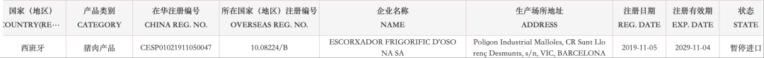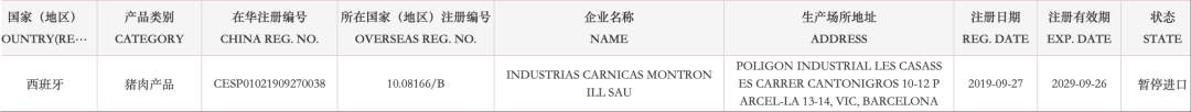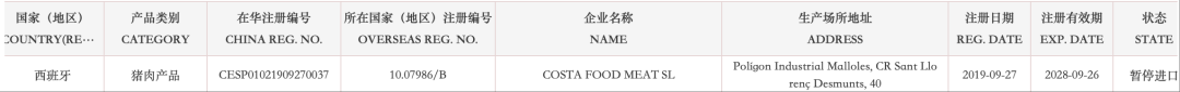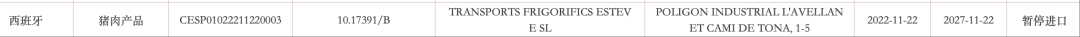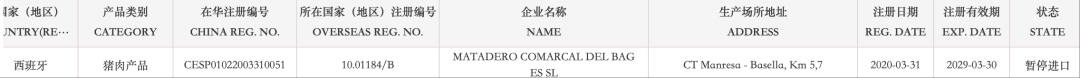 【准入更新】暂停西班牙多家猪肉企业产品输华