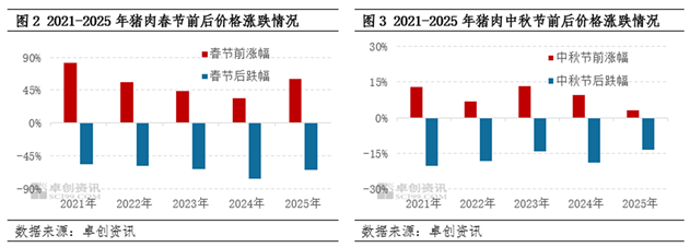 进入三、四季度,市场期待的“强反弹”并未如期而至。尽管9月开学季和中秋国庆双节带来了一定的备货需求,但屠宰企业的鲜销率提升幅度有限,所谓的“旺季”更多表现为价格的窄幅震荡而非单边上涨。从卓创资讯统计的数据来看,中秋节前需求对于价格的提振作用明显弱于春节,但节后价格回落的幅度往往更加显著。2025年中秋节前一周,白条猪肉价格仅仅上涨了3.12%,为近五年最低。而节后一周价格下跌的幅度则达到了13.57%,处于近五年平均水平附近。