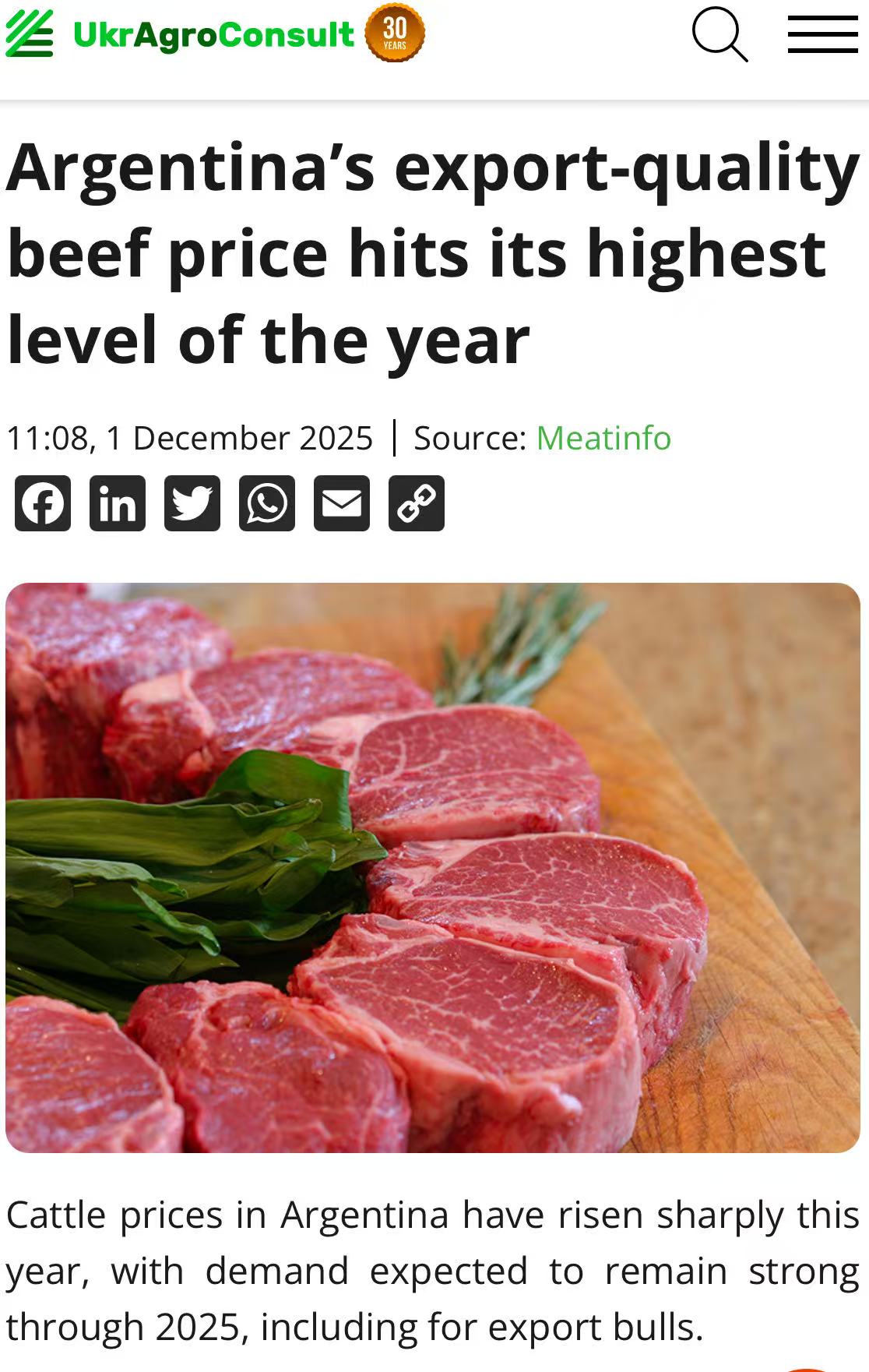 外媒消息:活牛缺货加上比索狂贬,把阿根廷出口级育肥公牛胴体价直接抬到7500比索/公斤,约合5.40 美元,创近年最高。同样的牛,阿根廷买得比邻国贵一大截:比乌拉圭贵5%,比巴拉圭贵31%,比巴西贵 44%。