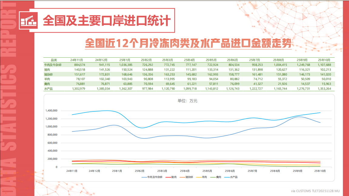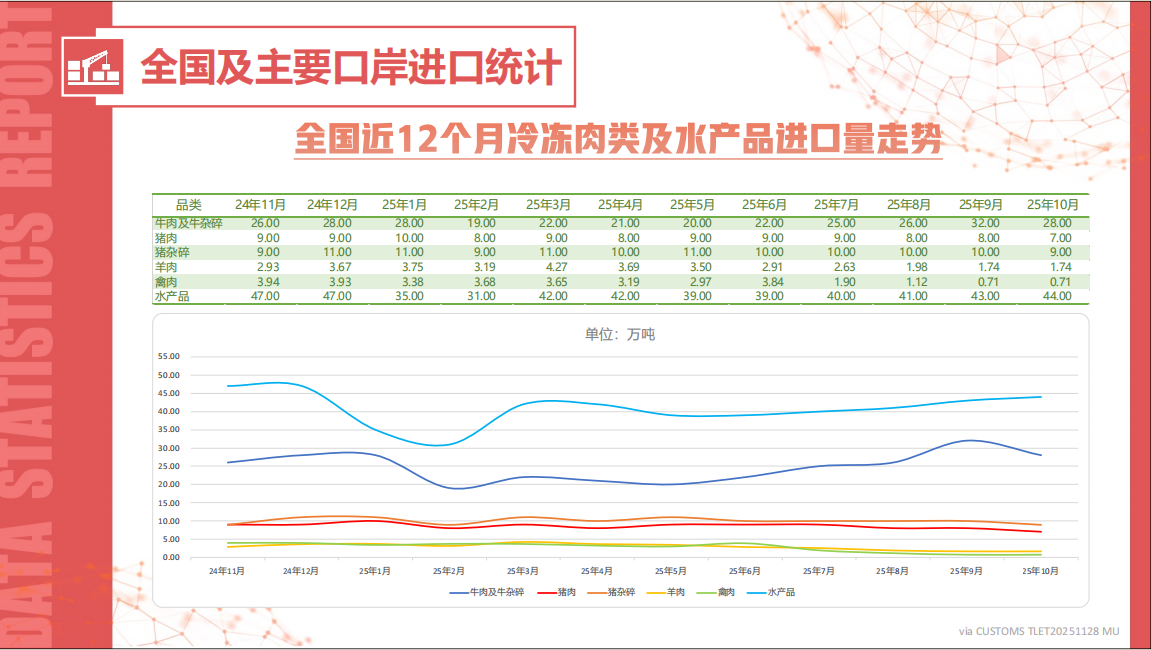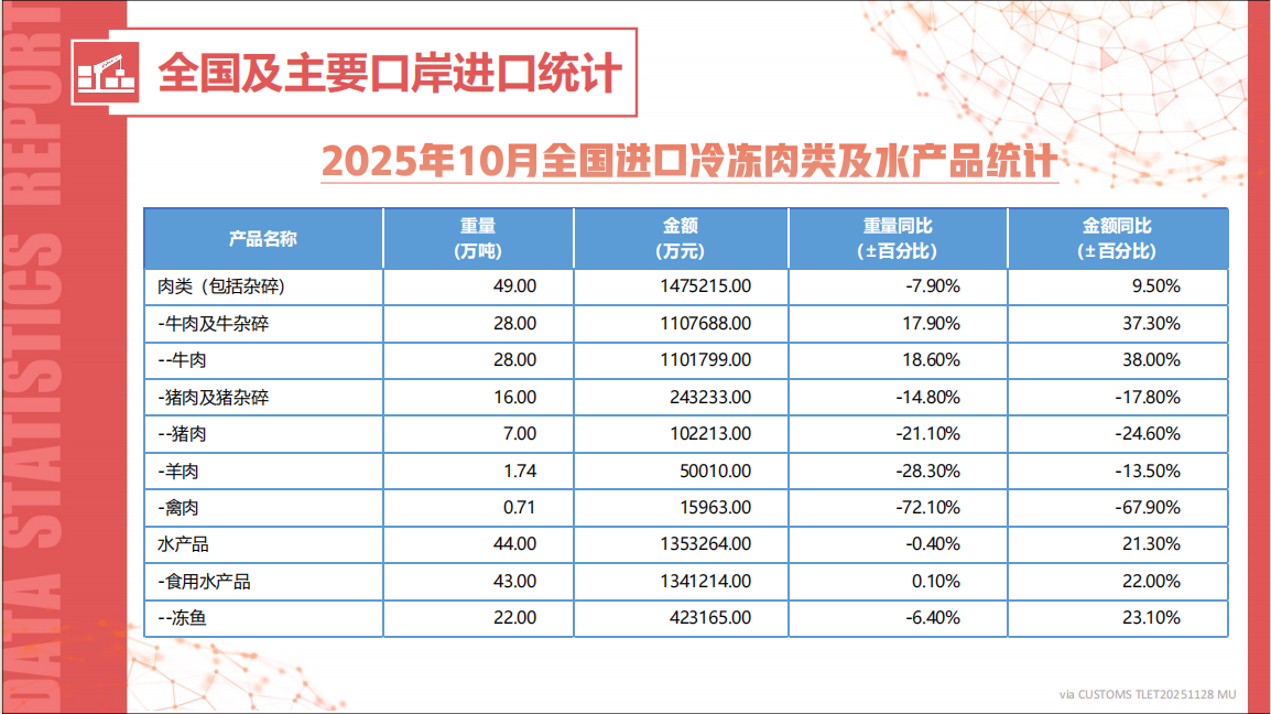 全国进口冷冻肉类及水产品统计