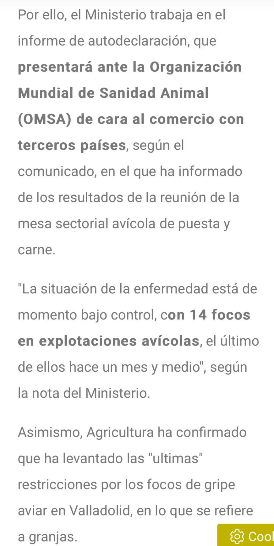农业部指出,尽管野生鸟类中仍检测到病毒,但这不影响商业家禽的“无疫状态”判定。截至目前,全国累计记录14起养殖场疫情,最后一起发生于一个半月前。巴利亚多利德省的最后一批限制措施也已解除。