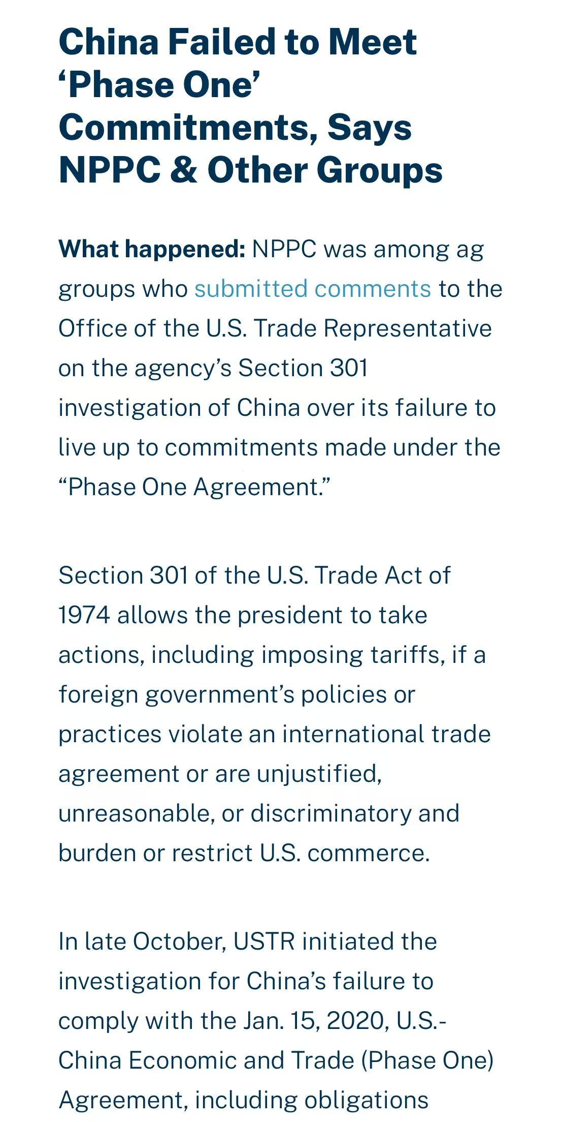 在美国贸易代表办公室(USTR)指控中国未履行中美第一阶段贸易协议农业条款的背景下,美国猪肉生产者理事会(NPPC)等农业团体近日提交意见书,支持USTR依据《1974年贸易法》第301条款对中国发起调查。