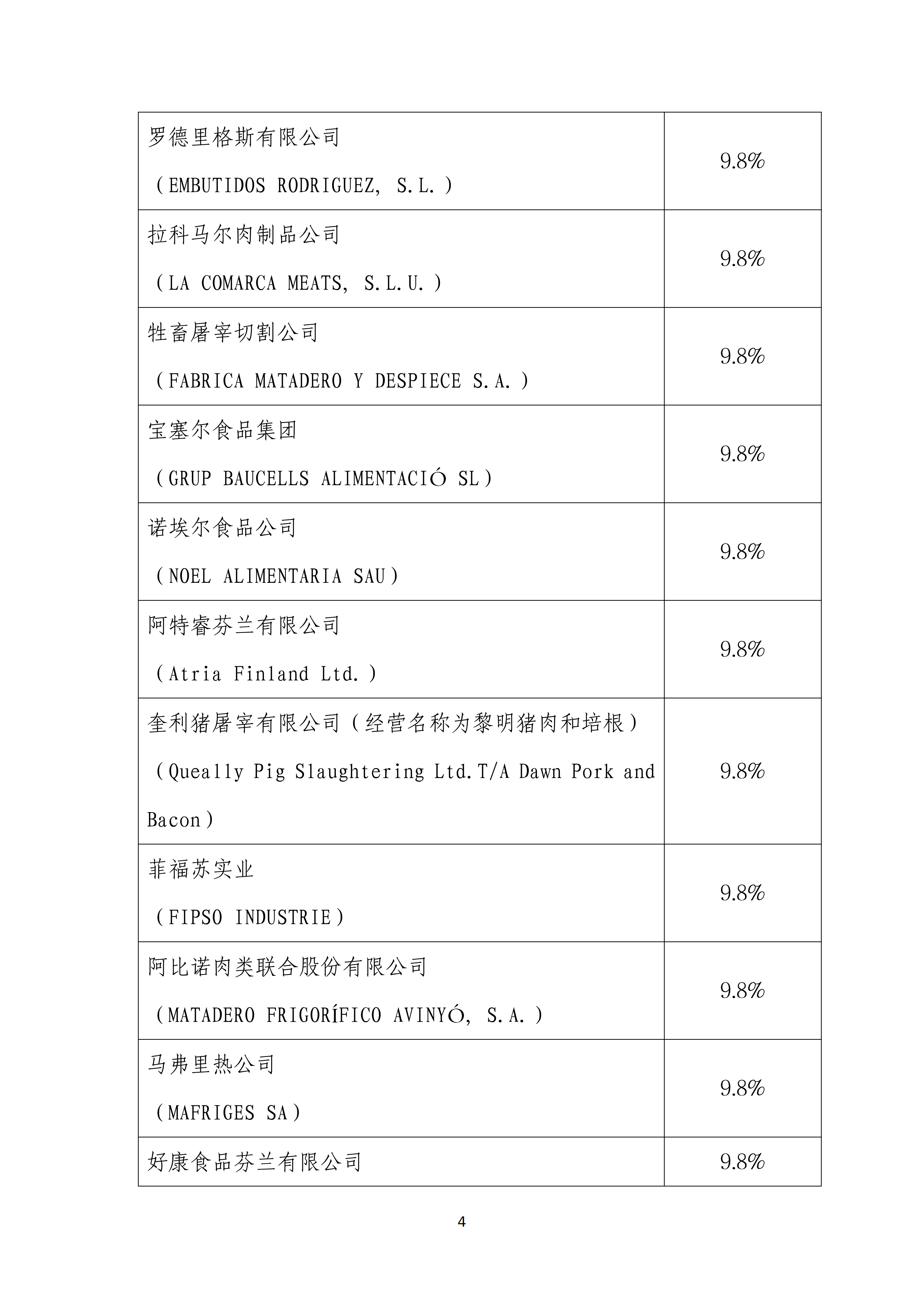 相关猪肉及猪副产品反倾销调查的最终裁定