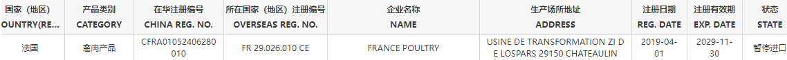 暂停受理法国1家禽肉企业(注册编码为:FR29.026.010CE)自2025年12月11日(含)起启运的输华产品进口申报。