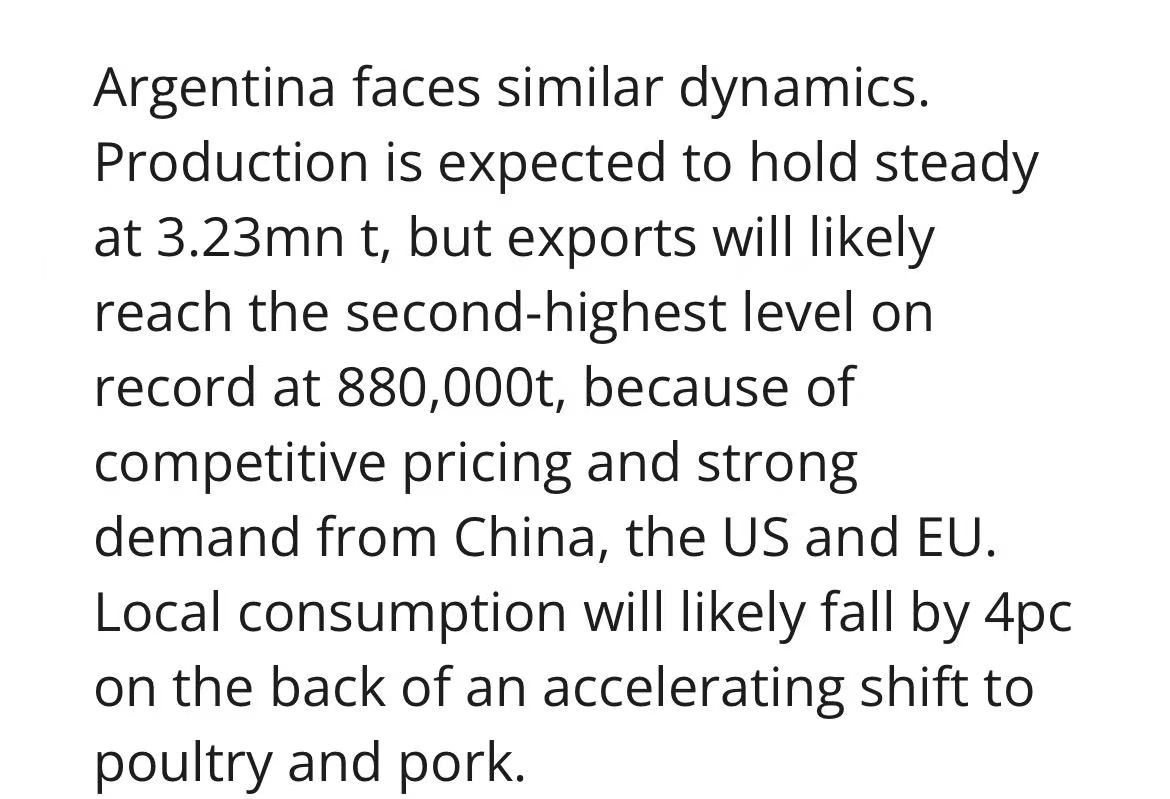 在高价格竞争力及中国、美国、欧盟需求支撑下,阿根廷2026年出口量或达88万吨,为历史次高。国内消费持续被禽肉、猪肉替代,预计下降4%。