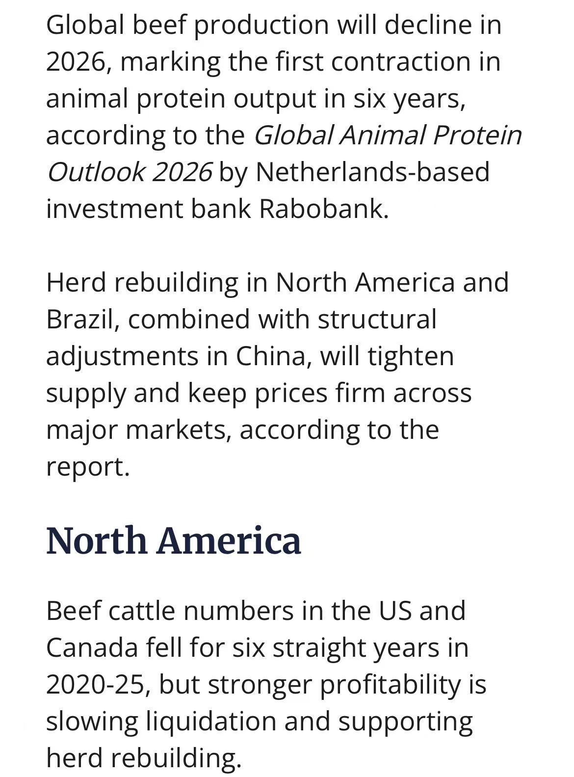 捷嘉 ·关注 | Rabobank报告预测:2026年全球牛肉产量将现六年首降,主因牛群重建与供应趋紧