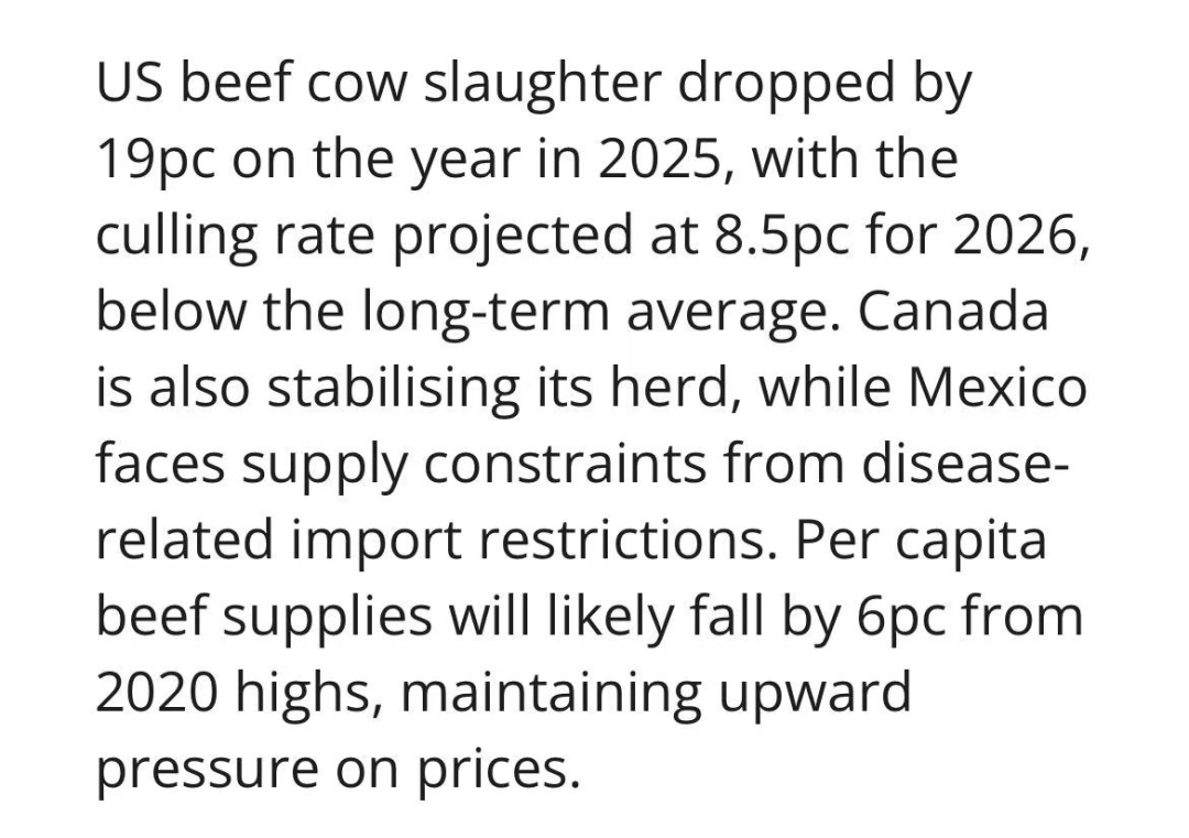 美国、加拿大肉牛存栏自2020年起已连续六年同比下降。2025年美国母牛屠宰量锐减19%,2026年淘汰率或降至8.5%,低于长期均值;加拿大存栏亦止跌企稳。墨西哥仍受动物疫病进口限制,供应继续受限。