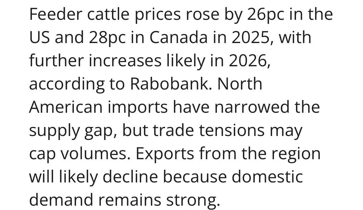 Rabobank预计,北美人均牛肉可支配供应量将较2020年峰值下滑约6%,价格支撑强劲。2025年美国育肥牛价已涨26%,加拿大涨28%,2026年仍有上行空间。区域进口增量或受贸易摩擦限制,而强劲内需将迫使北美出口继续回落。