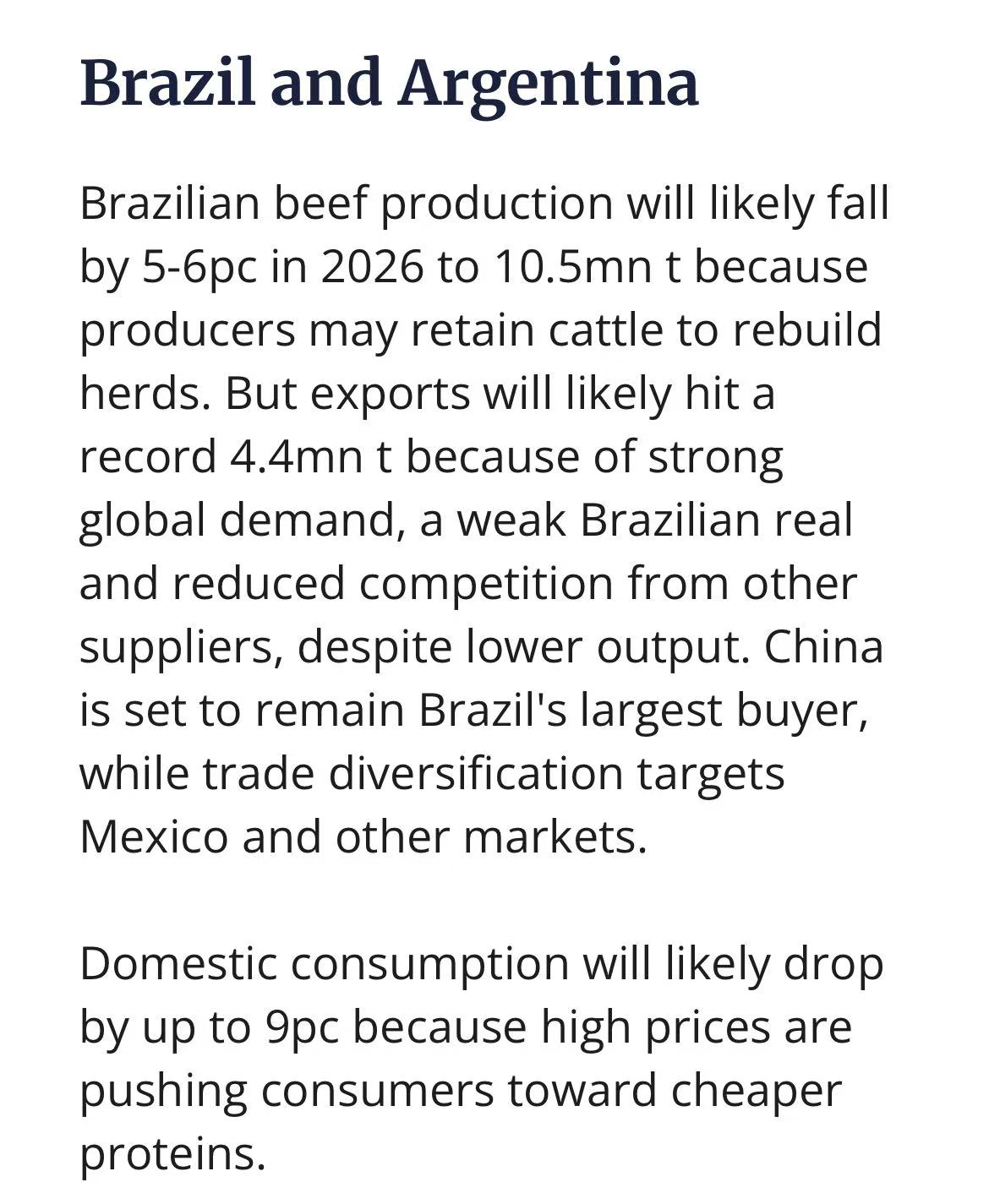 养殖户留养母牛,2026年巴西屠宰量预计减少,牛肉产量降至1,050万吨(胴体当量,下同)。全球需求旺盛、雷亚尔贬值、竞争对手供给减少,三方因素叠加,出口量有望逆势增至440万吨,刷新历史纪录。中国仍是最大买家,墨西哥、中东贡献新增量。国内因零售价高企,消费或下滑9%。