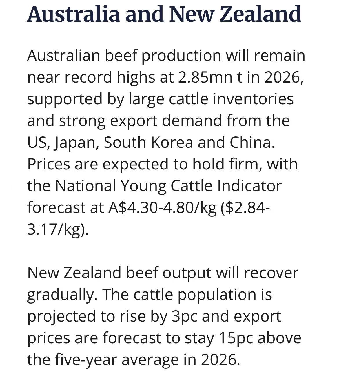澳大利亚2026年产量预计维持285万吨,接近历史峰值;NYCI青年牛指数或保持在4.30–4.80澳元/公斤活重(约2.84–3.17美元)。新西兰牛群规模恢复3%,出口价仍较五年均值高15%。
