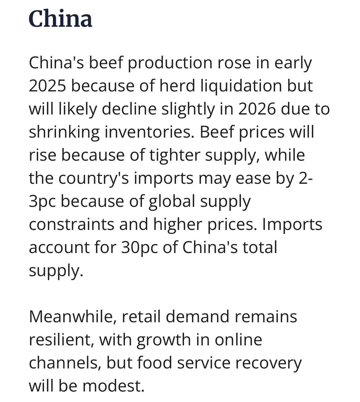 经历了2024年去产能,2025年初产量短暂回升,但2026年存栏下滑将带动产量小幅回落。全球高价背景下,中国牛肉进口量或收缩2%–3%(目前进口占比约30%,胴体当量计)。零售端线上渠道保持韧性,餐饮复苏仍温和。
