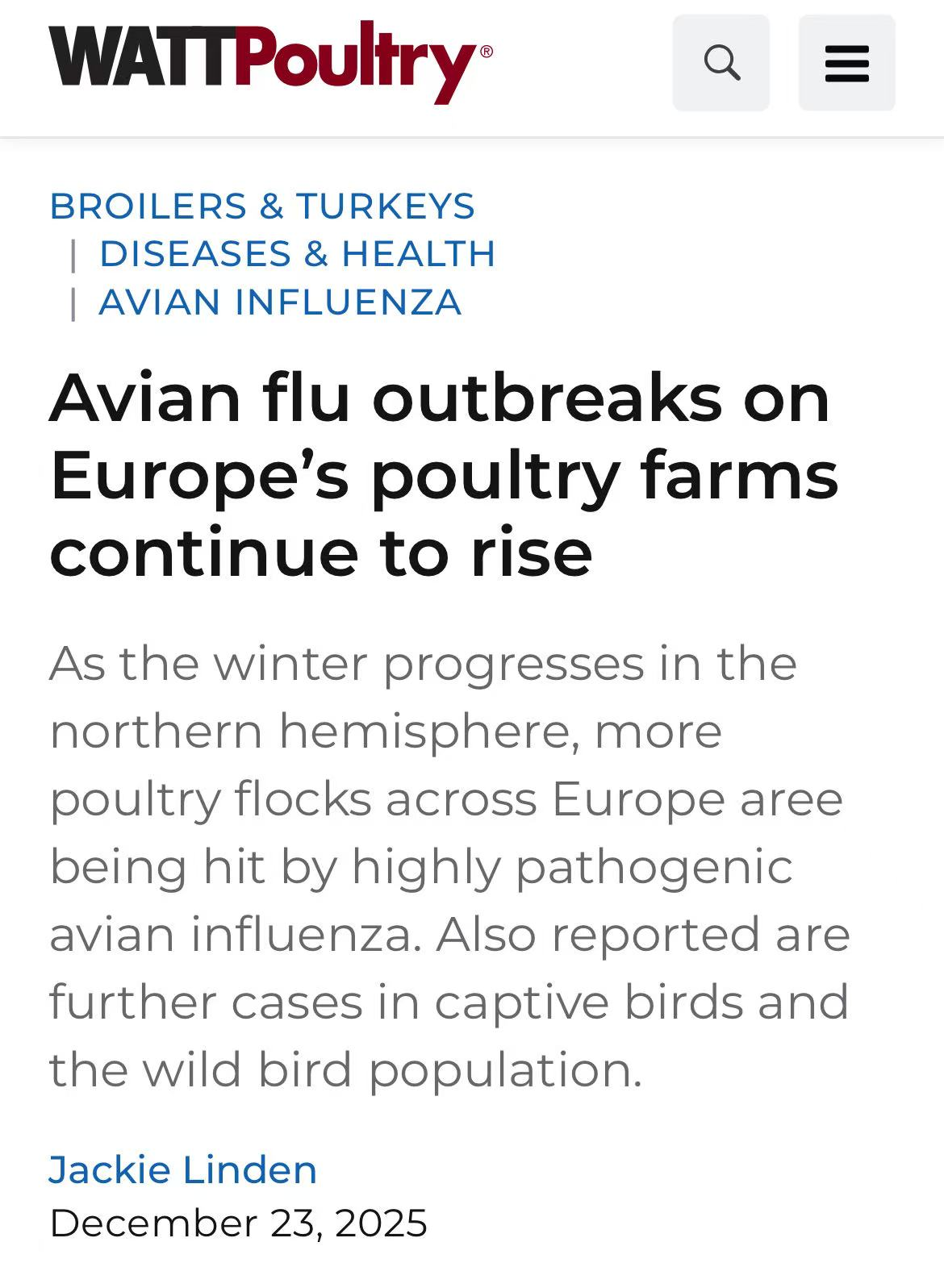 欧洲冬季禽流感疫情持续扩散,波及范围进一步扩大。近期多国商业养殖场、圈养鸟类及野生鸟类中均报告新增高致病性禽流感(HPAI)病例,疫情呈现快速蔓延态势。