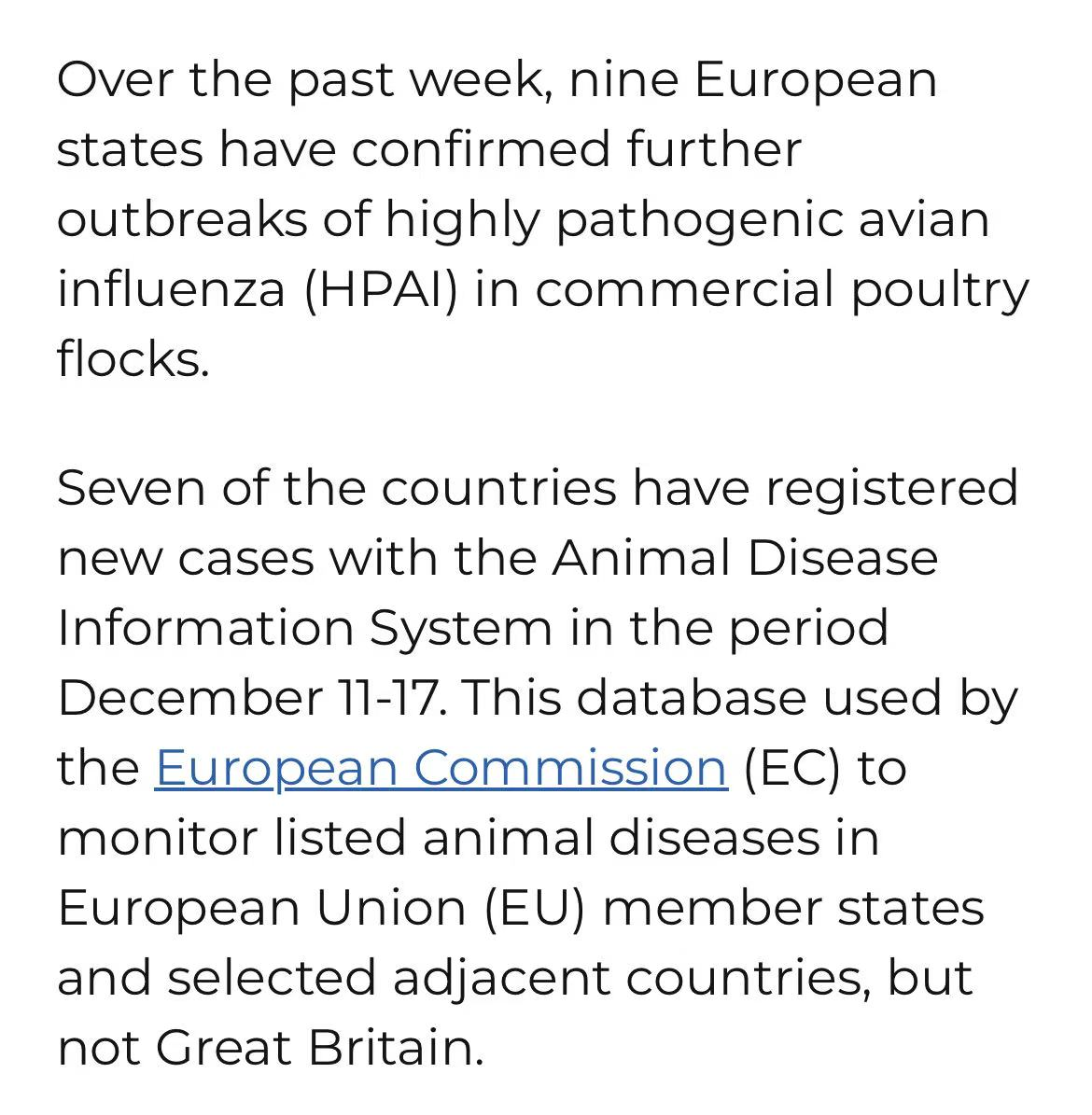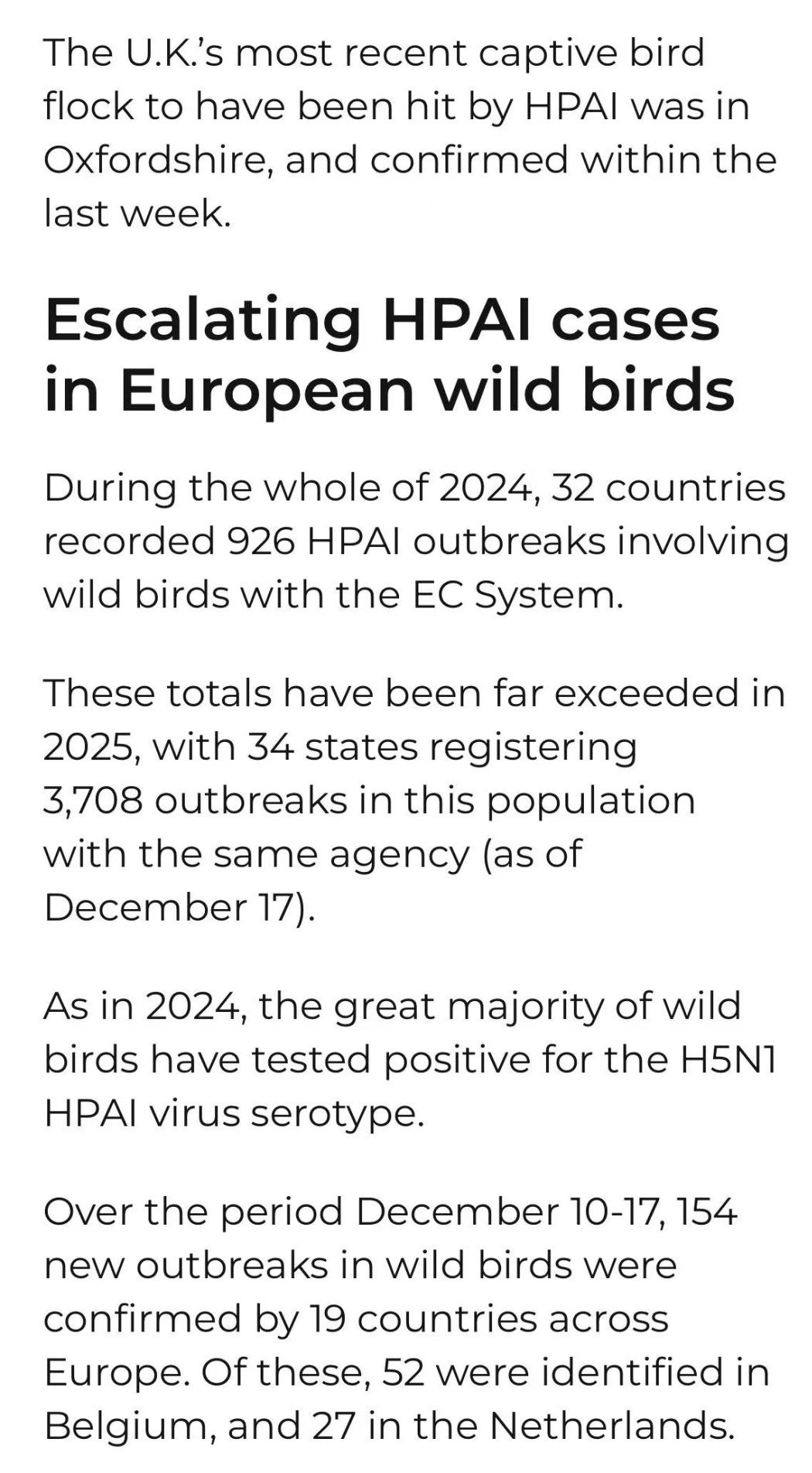 整体来看,随着冬季气候持续,欧洲禽流感疫情仍在扩大,对家禽养殖和野生鸟类均构成严重威胁。