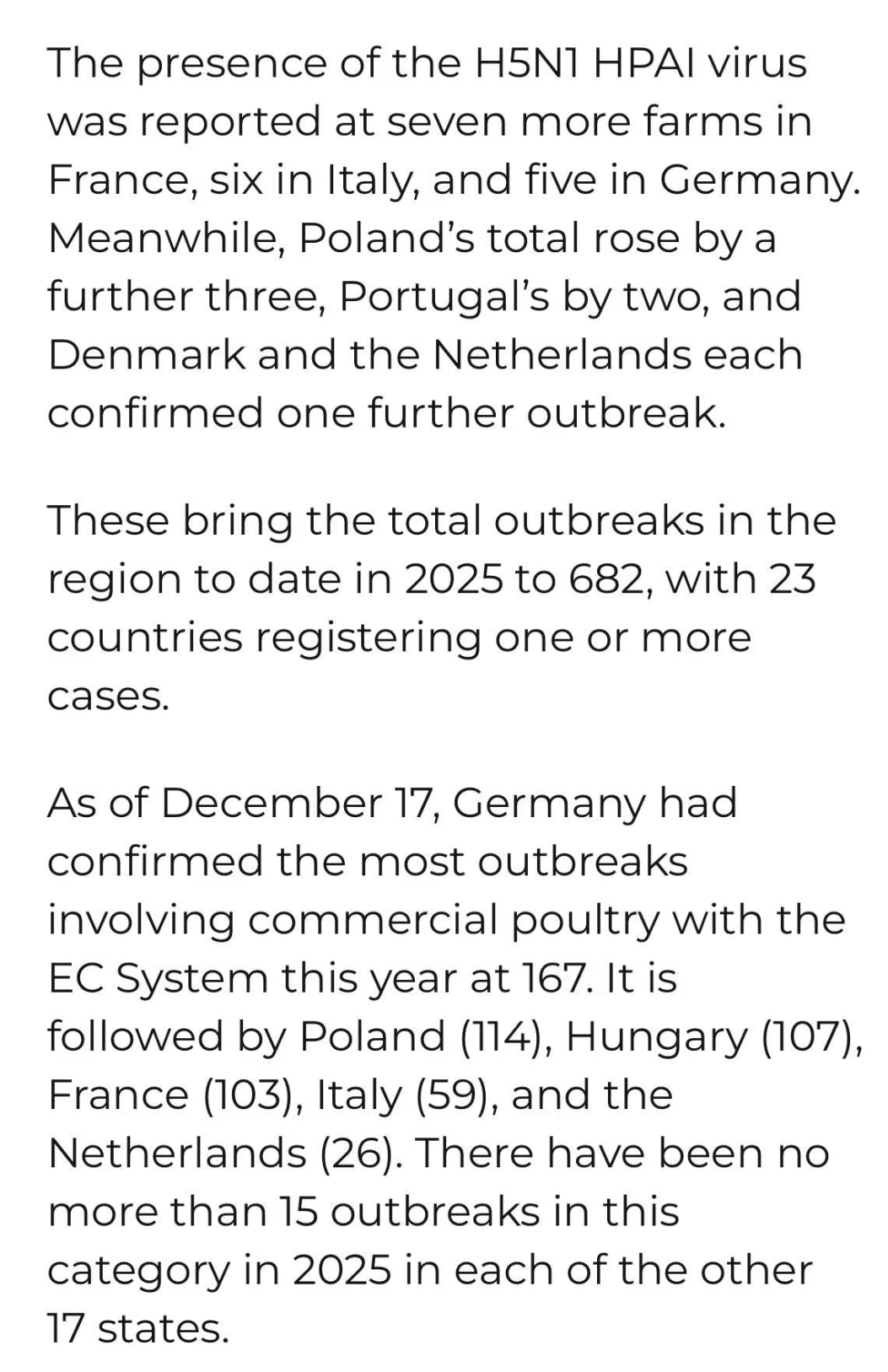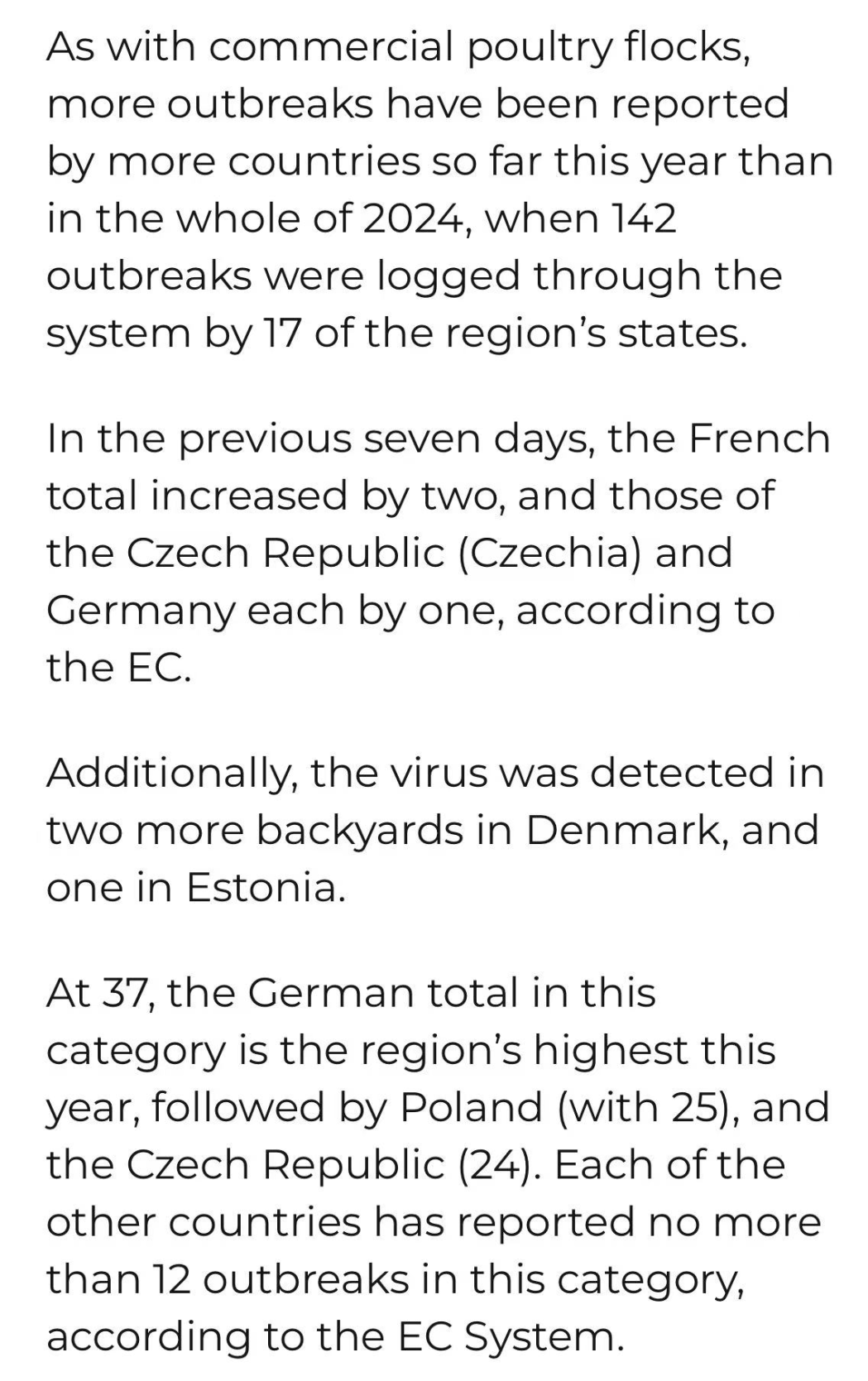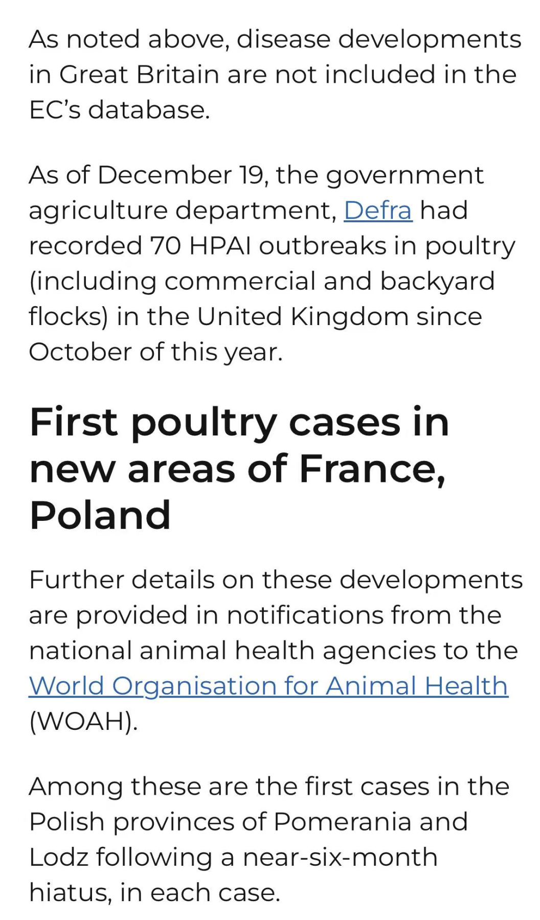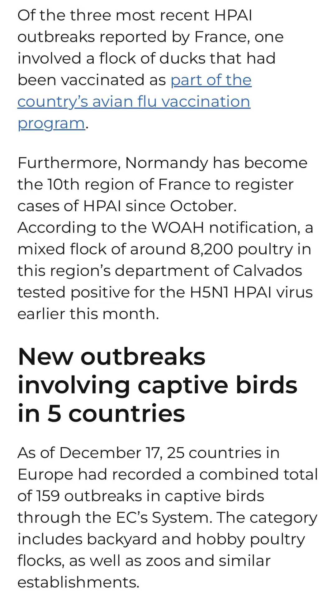 值得注意的是,法国和波兰均有新的地区首次报告家禽感染。法国一处已接种疫苗的鸭群也发生疫情,诺曼底大区成为近期法国第10个出现病例的地区。