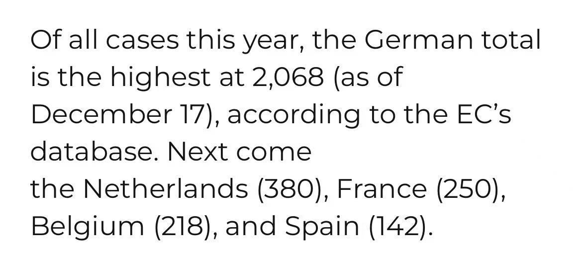 野生鸟类中的疫情尤为严峻。截至12月17日,欧洲34国已报告3708起野生鸟类疫情,远超2024年总数,其中绝大多数为H5N1型病毒。德国、荷兰、法国是目前野生鸟类病例最多的国家。