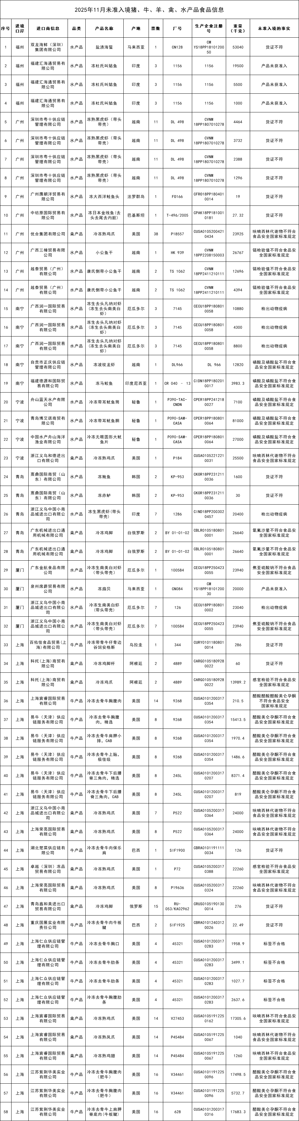 捷嘉 ·关注 | 11月未准入境猪牛羊禽水产共计266批次