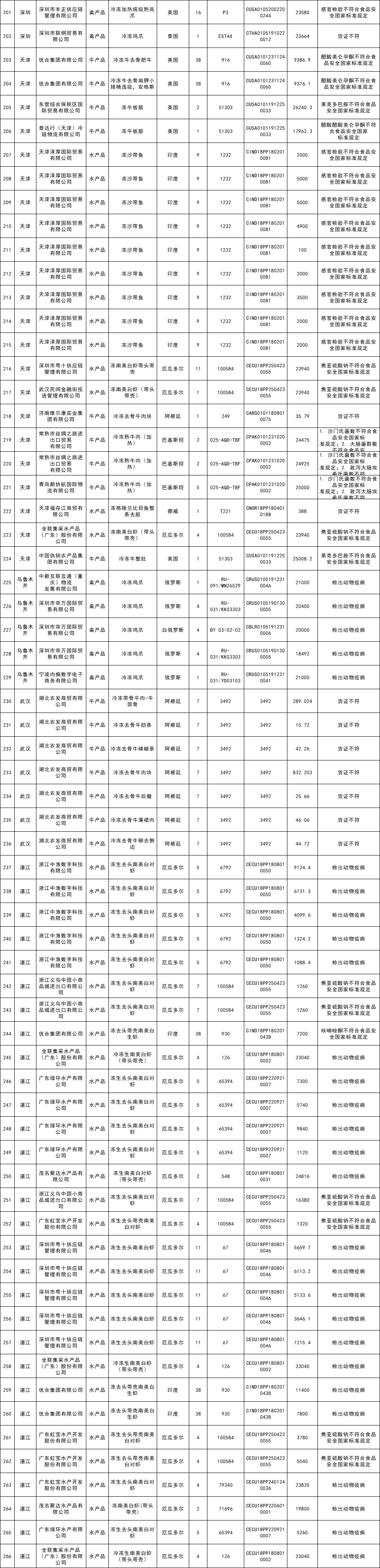 11月未准入境猪牛羊禽水产共计266批次
