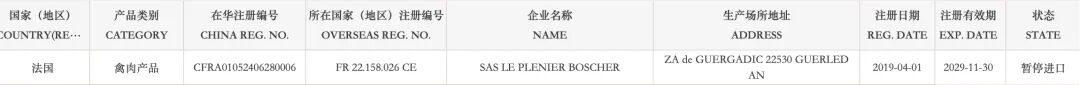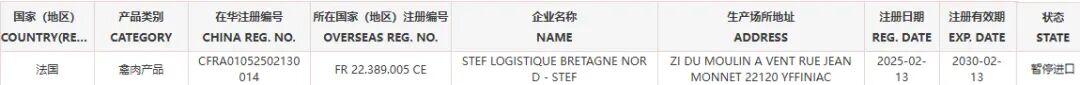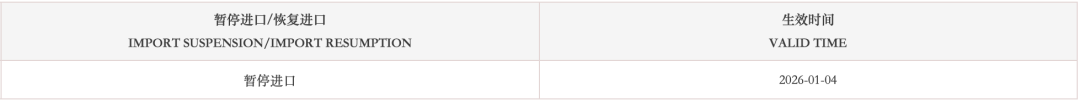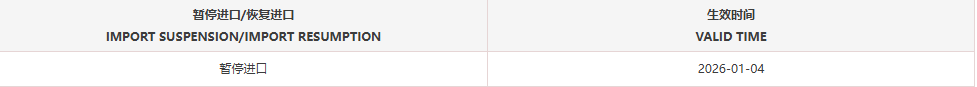 暂停受理法国2家禽肉企业(注册编码为:FR22.158.026CE、FR22.389.005CE)自2026年1月4日(含)起启运的输华产品进口申报。
