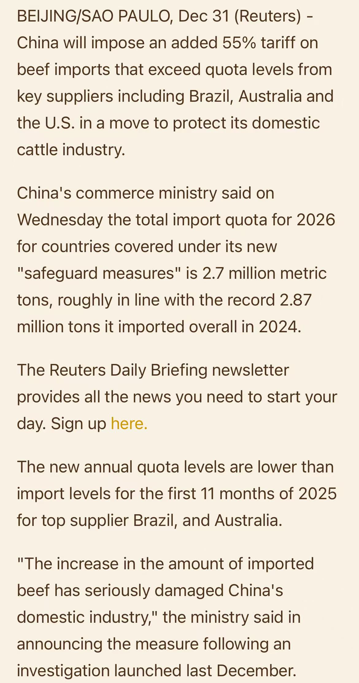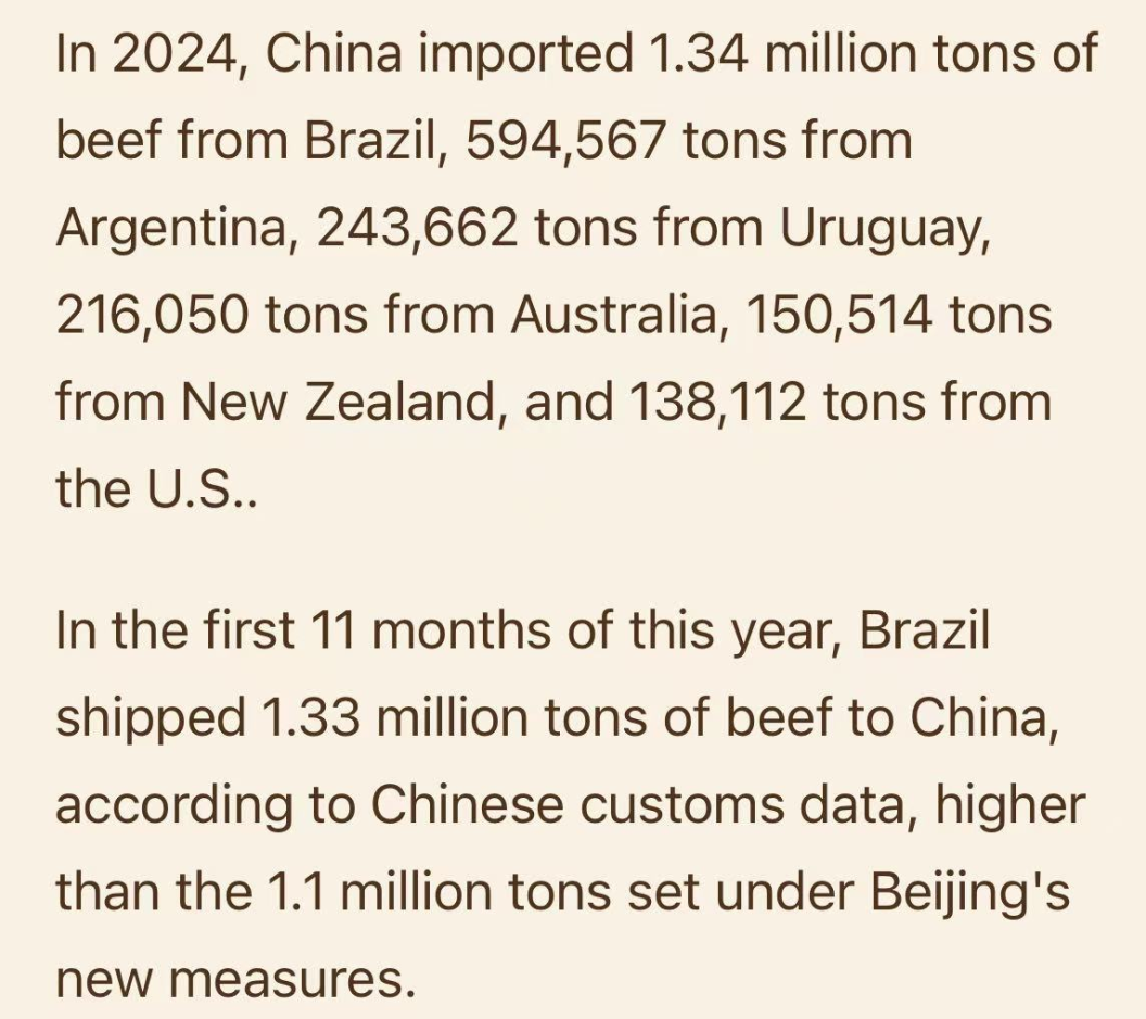 中国商务部宣布,自2026年1月1日起对牛肉进口实施三年期保障措施:2026年,巴西的进口牛肉配额最高,为110.6万吨,其次是阿根廷,51.1万吨,乌拉圭32.4万吨。新西兰和澳大利亚的进口配额分别为20.6万吨、20.5万吨。美国仅有16.4万吨。超出配额的部分,需要加征55%的关税。该配额与2024年全年中国牛肉进口总量相近,但低于2025年前11个月主要供应国的实际对华出口量。
