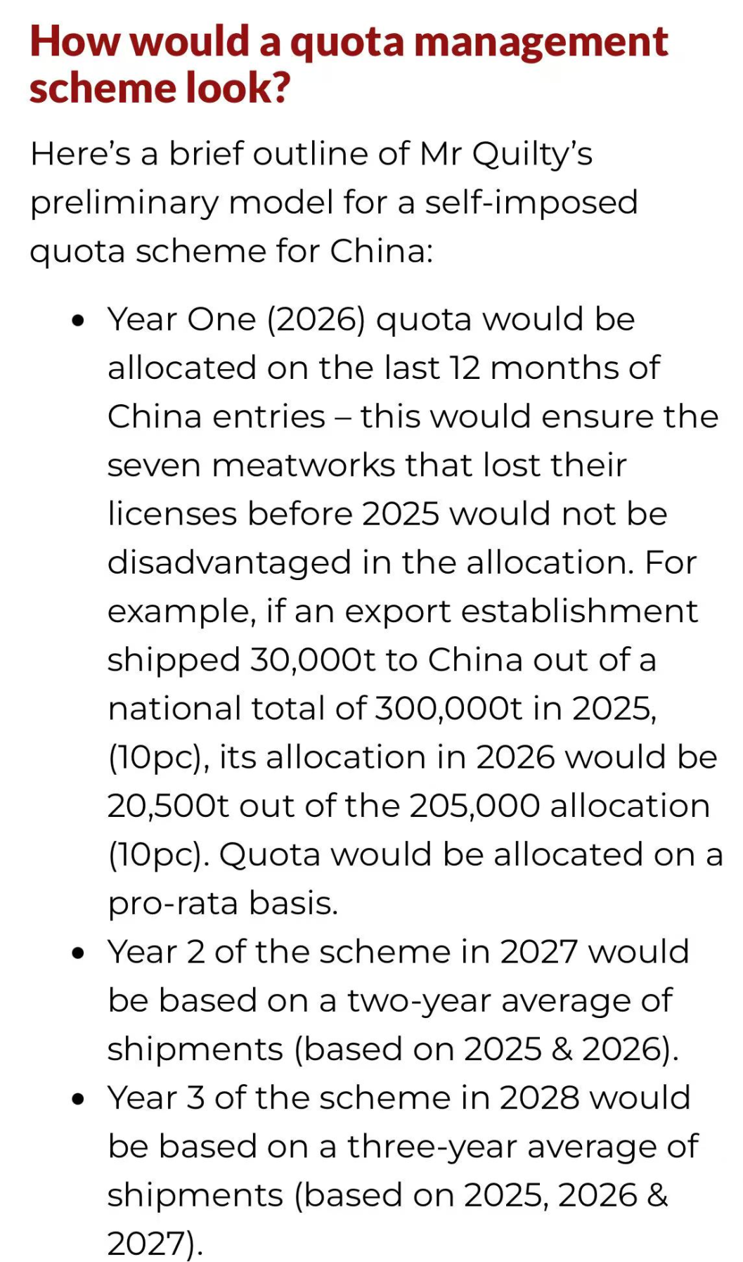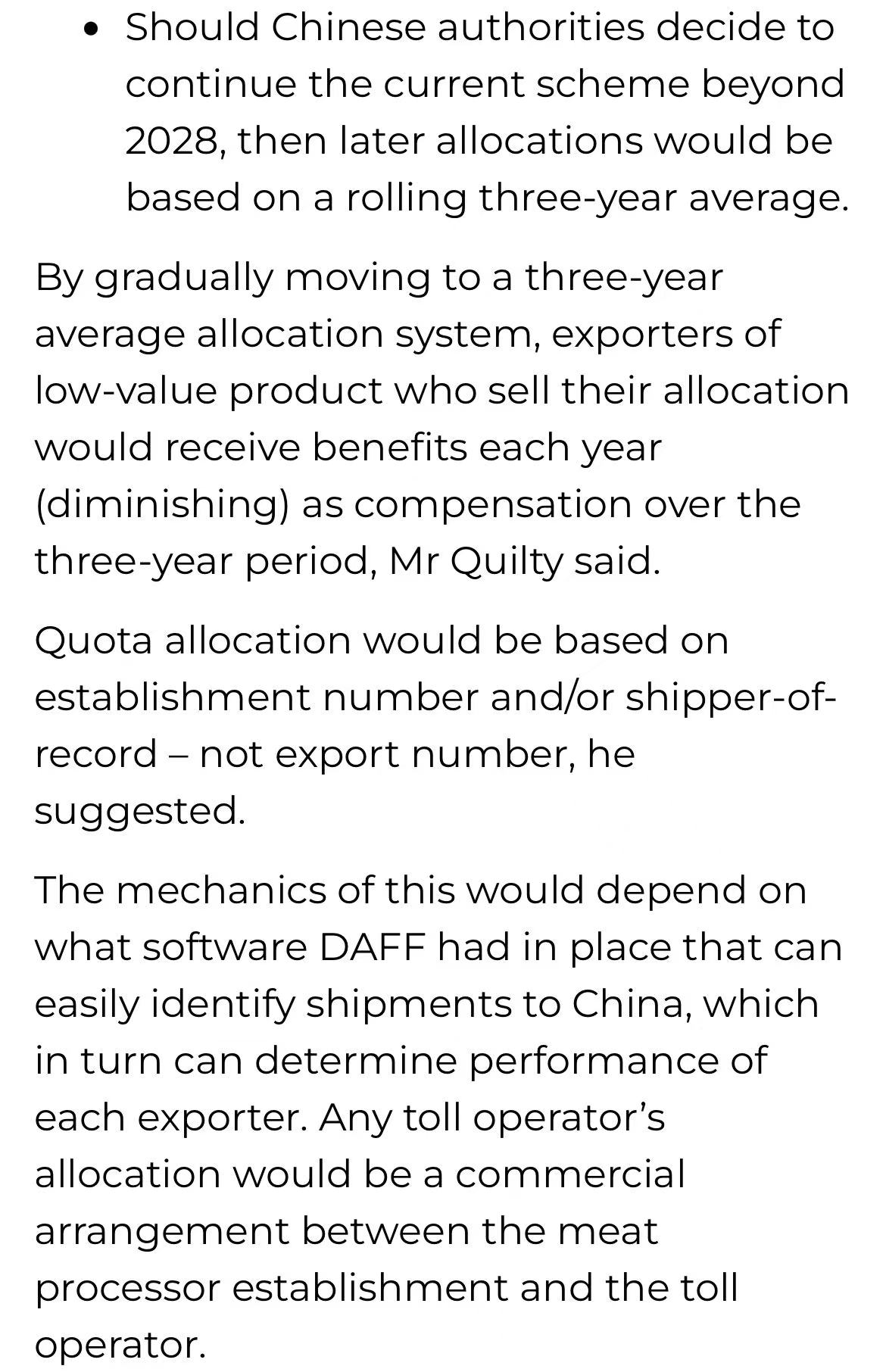 为此,行业分析师Quilty建议在政府监督下由行业自主分配配额,按企业过往出口记录确定额度,并允许配额流转。该方案旨在引导有限配额用于高附加值产品,避免被低价值品类占用,从而稳定澳大利亚牛肉价格与养殖户收益。