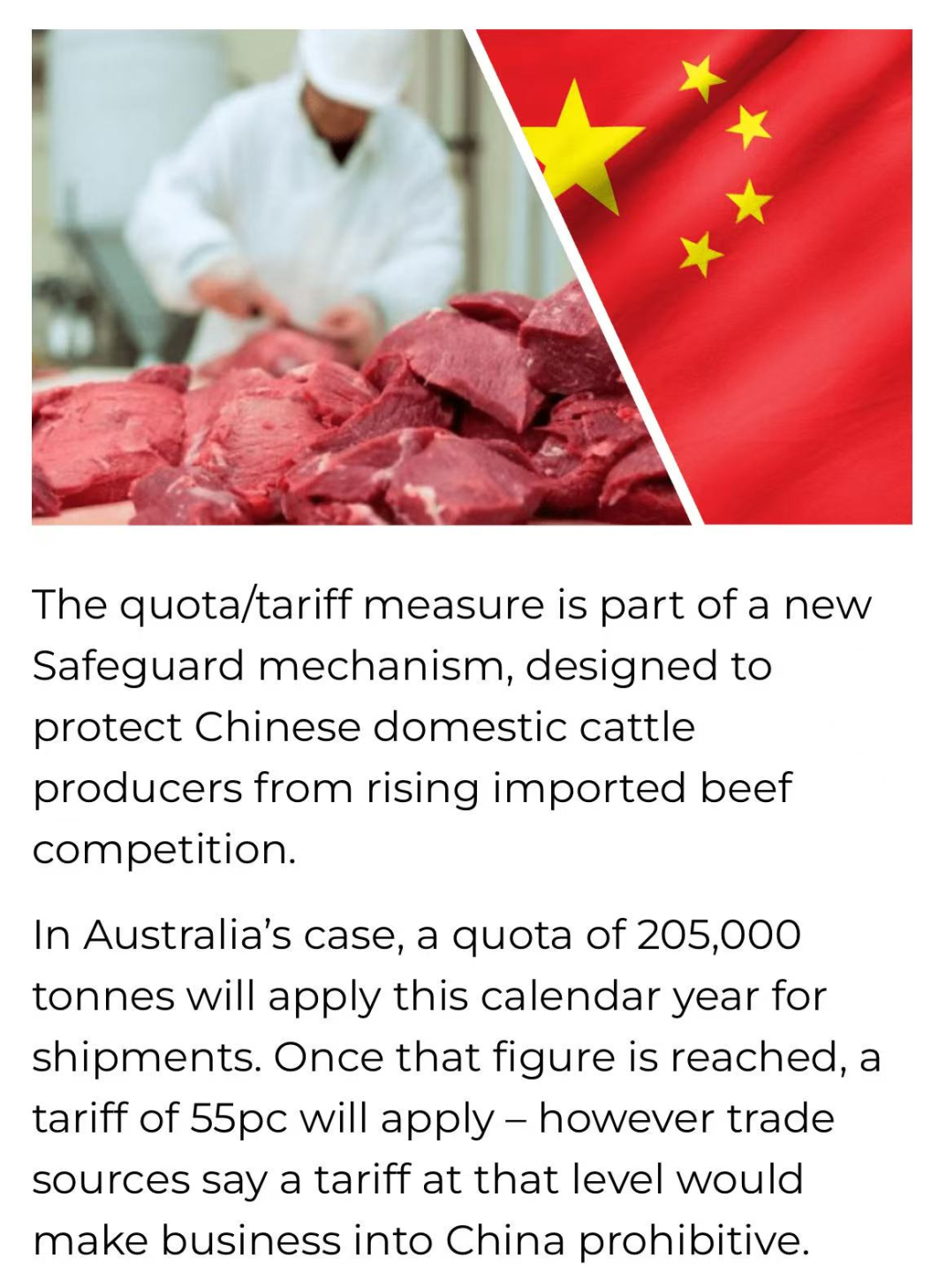 澳大利亚牛肉行业正积极推动建立一套对华出口“自主管理配额”机制,以应对中国实施的进口保障措施。根据中国新规,澳大利亚2026年对华牛肉出口配额为20.5万吨,超额部分将面临55%的高关税,这实质上可能阻断超出配额部分的贸易。
