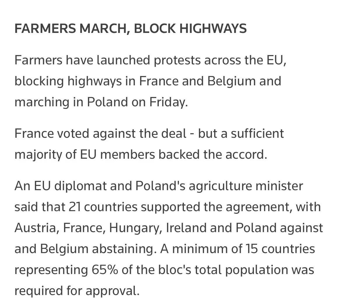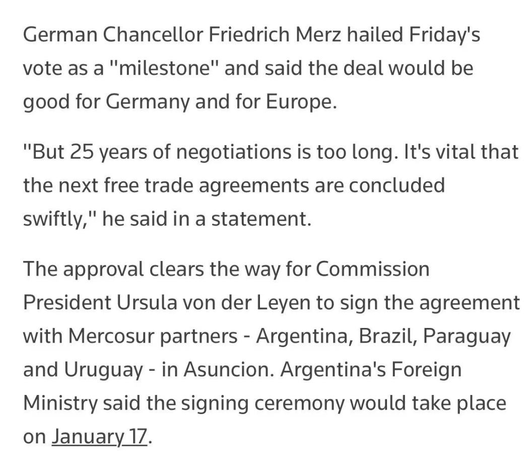 在历经四分之一世纪的艰难谈判后,欧盟与南美南方共同市场(Mercosur)的自由贸易协定终于冲破最后一道内部障碍。尽管法国等国因担心冲击本土农业而激烈反对,欧盟多数成员国仍在1月9日投票支持,为这项划时代协议的签署扫清道路。