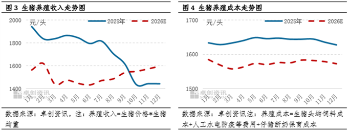 卓创资讯预计2026年生猪养殖收入或同比回落11.57%。养殖收入主要受生猪价格及生猪交易均重影响。从生猪行情来看,2026年生猪供应或较为充沛,猪价有同比回落的可能。由于能繁母猪存栏量影响10个月后的生猪出栏量,因此2025年3月-2026年2月的能繁母猪存栏量影响2026年的生猪供应量。根据卓创资讯监测的样本企业能繁母猪存栏量来看,2025年7月份能繁母猪存栏量开始出现下滑动作,且连续3个月降幅超过1.00%,但此后跌幅较为有限,因此2026年上半年生猪价格或呈现震荡下滑态势,下半年有上涨空间,但受去产能速度较慢的影响,猪价回暖速度或较为缓慢。结合生猪交易均重,卓创资讯预计2026年生猪养殖收入或呈春节前最高、此后快速回落至低位、下半年震荡上涨的趋势。