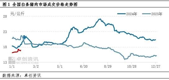 2025年白条猪肉价格震荡回落后价格持续横盘,6月短暂小幅上涨,7月初再度下降持续到10月份,10月份创新低后小幅反弹,11月呈现缓跌状态,12月中下旬猪肉价格反弹至2026年1月份。根据卓创资讯数据监测,3-11月白条猪肉月均价分别为18.85元/公斤、18.91元/公斤、18.63元/公斤、18.09元/公斤、18.61元/公斤、17.64元/公斤、16.86元/公斤、14.75元/公斤、15.15元/公斤、15.10元/公斤,环比波动幅度分别为-2.00%、0.34%、-1.48%、-2.88%、2.84%、-5.17%、-4.46%、-12.51%、2.73%、-0.33%。而截止到2026年1月26日,1月全国白条猪肉市场月度平均成交价为16.56元/公斤,较2025年12月份上涨,主要是因为能繁母猪存栏量下降后兑现出栏量缩减叠加养殖端压栏增重,供应收紧叠加需求提升。