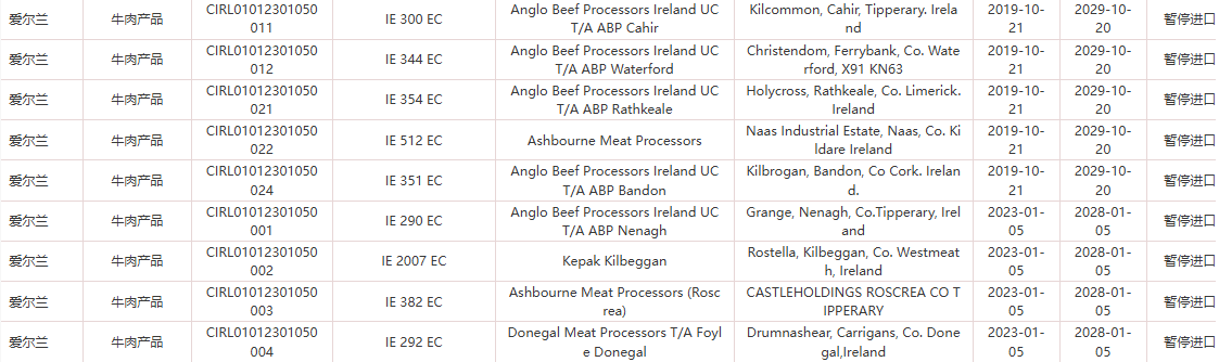 暂停受理爱尔兰23家牛肉企业(注册编码为:IE 300 EC、IE 344 EC、IE 354 EC、IE 512 EC、IE 351 EC、IE 290 EC、IE 2007 EC、IE 382 EC、IE 292 EC、IE 296 EC、IE 368 EC、EC 033、IE 325 EC、IE 297 EC、IE 350 EC、IE 364 EC、IE 079 EC、IE 2048 EC、IE 378 EC、IE 317 EC、IE 311 EC、IE 313 EC、IE 533 EC)自2026年1月27日(含)起启运的输华产品进口申报。