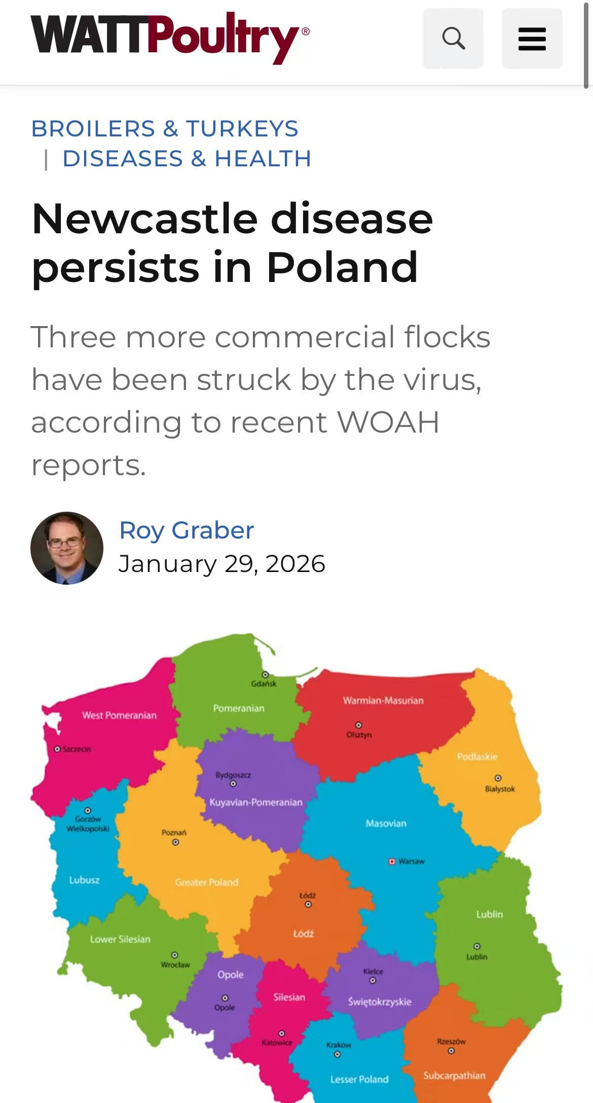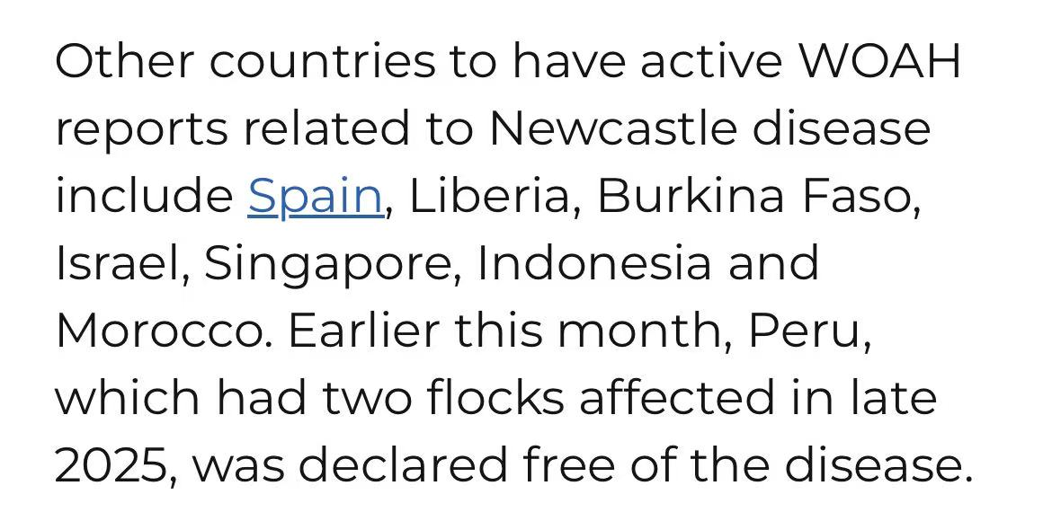 波兰新城疫疫情持续,三起新病例涉及超13万只家禽。据世界动物卫生组织通报,近期两个商业肉鸡群与一种鹅群暴发疫情,感染源尚未明确。当局已实施扑杀、分区管控、移动限制等防控措施。