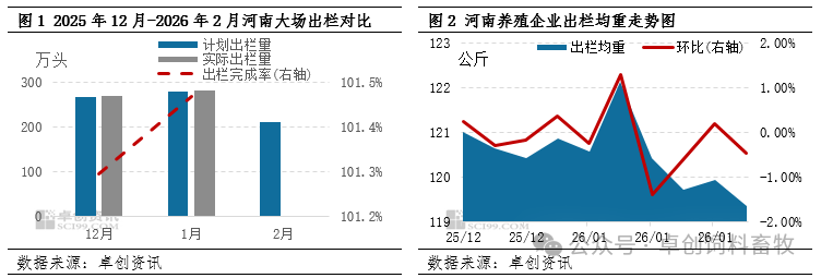 据卓创资讯监测数据显示,2025年12月-2026年1月连续两月河南养殖场月度出栏计划完成率超100%,分别为101.30%和101.47%。养殖企业对后市看涨预期不足,加之后期月度出栏计划逐月递增,为缓解出栏压力,企业不断加快出栏节奏,生猪出栏均重逐步降低。其中12月均重降幅偏慢,月末及月初有大猪集中出栏现象。进入1月后出栏加速,据监测,截至2月5日,河南养殖场出栏均重降至119.36公斤,较12月末下滑1.5公斤,降幅1.24%。