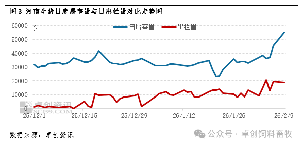 整个1月,河南散户出栏积极性持续偏低,受肥标价差走阔影响,散户惜售增重等价,标猪几无出栏。且散户适重猪价格与规模场相差无几,在河南与省外价差不足以支撑跨区域调运的情况下,省内屠宰厂对省内规模场猪源依赖度偏高,在规模场认卖积极性较高的背景下,随着屠宰厂在1月中旬震荡增量影响下,规模场猪源消化速度加快。这也与规模场1月开始减重出栏的计划不谋而合。但春节时间较往年偏晚,2月屠宰端增量延后开启,且因气温较往年偏高等因素,增量不及预期。据卓创资讯监测,2月9日河南样本企业日度屠宰量增至55050头,较月初增21950头,增幅66.31%。