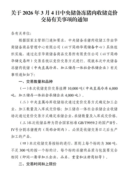 刚看到一个通知:3月4日将进行中央储备冻猪肉收储竞价交易,挂牌量1万吨。