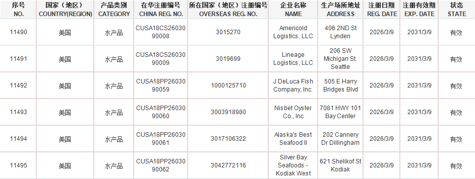 海关总署新增美国6家水产品企业输华注册(注册编码为:3015270、3019699、1000125710、3003918980、3017106322、3042772116)自2026年3月9日(含)后生产的输华产品进口准入。