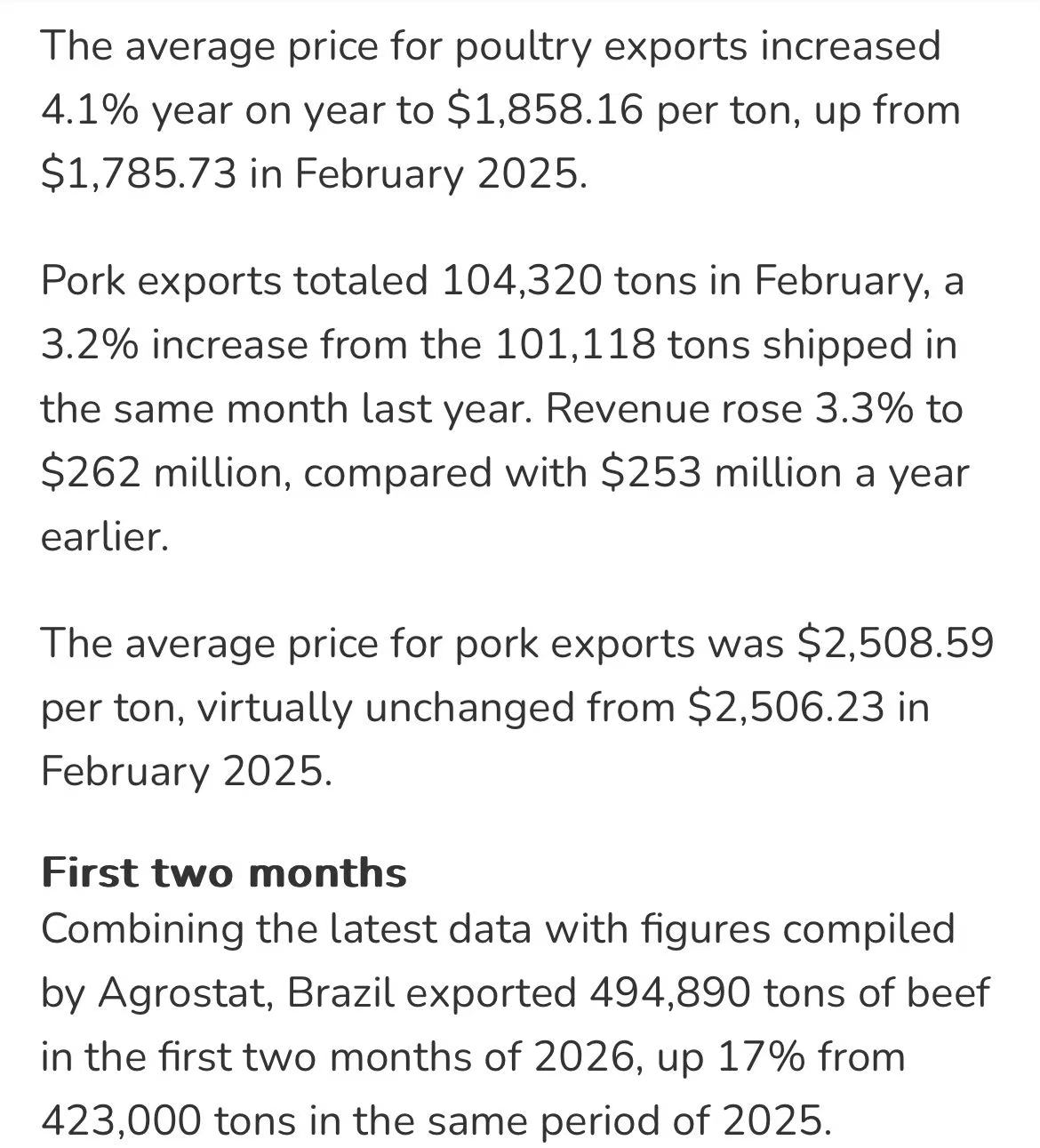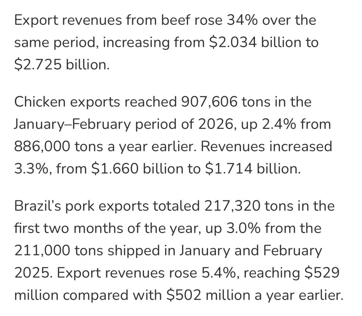 前两月累计,巴西牛肉出口量49.489万吨,同比增长17%;出口收入27.25亿美元,同比增长34%。