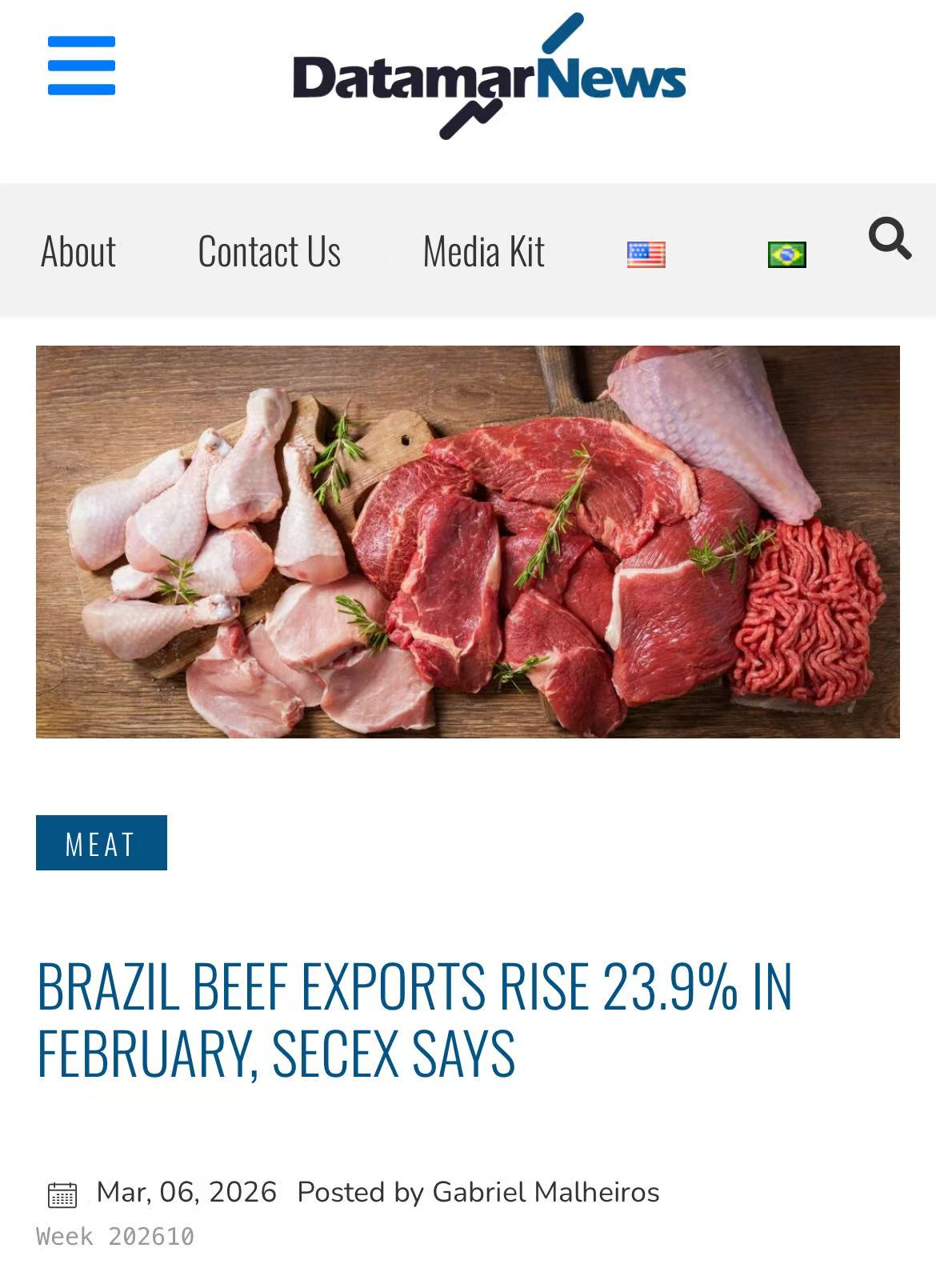 巴西外贸秘书处(Secex)最新数据显示,2月巴西牛肉出口延续强势。