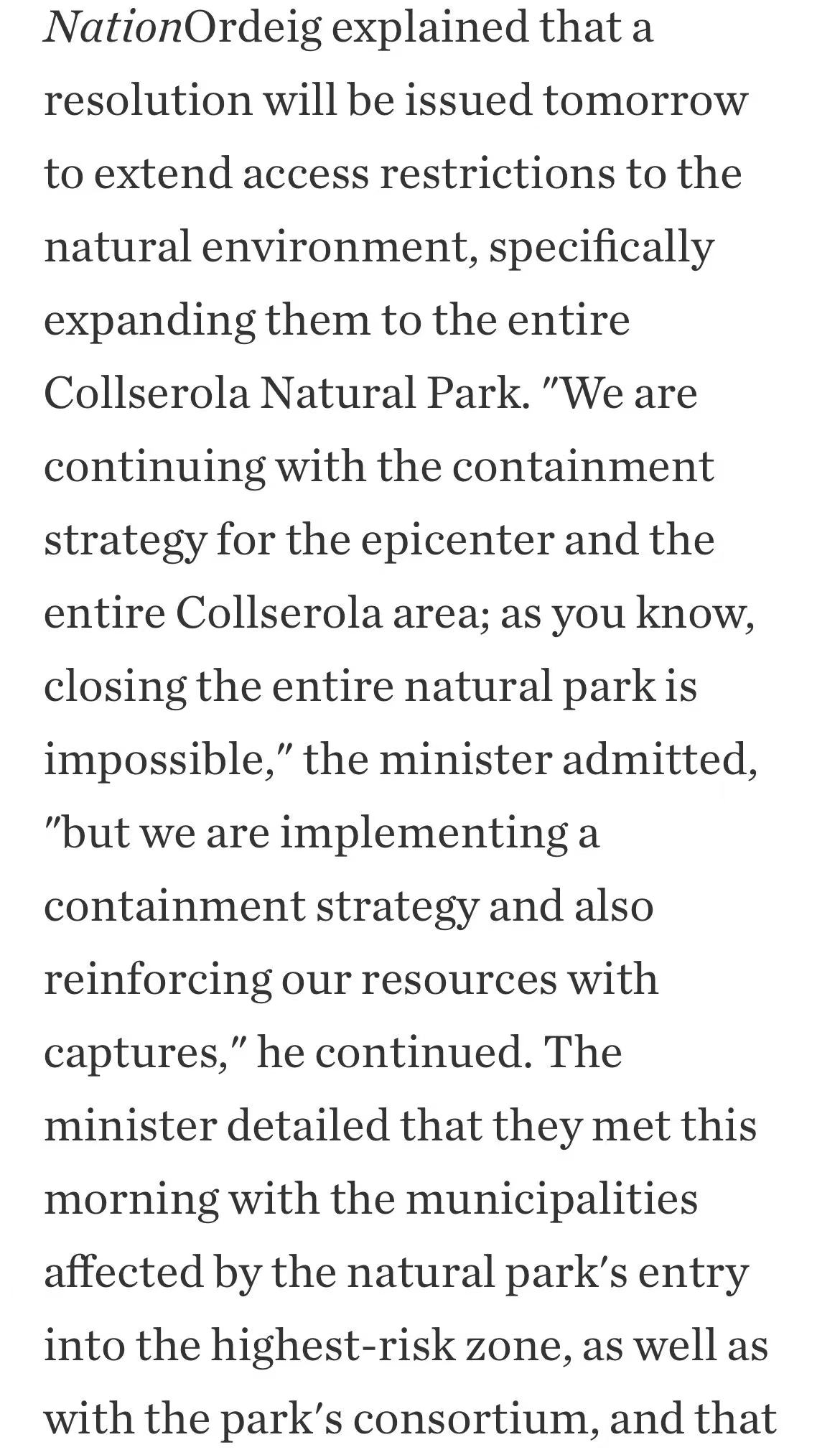 当局宣布自本周四起对科尔塞罗拉自然公园实施永久性完全封闭,禁止从任何市镇进入山区。受限制进入自然环境的市镇总数增至18个,分布在巴列斯 occidental 和巴霍夫雷加特地区之间。目前已有9个市镇确诊阳性病例,包括策尔达尼奥拉(震中)、圣基尔泽、巴塞罗那等。