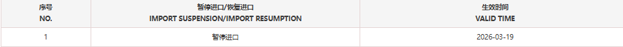 暂停受理新西兰1家牛肉企业(注册编码为:ME124)自2026年3月19日(含)起启运的输华产品进口申报。