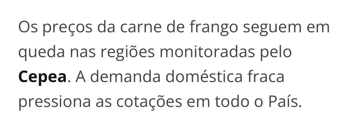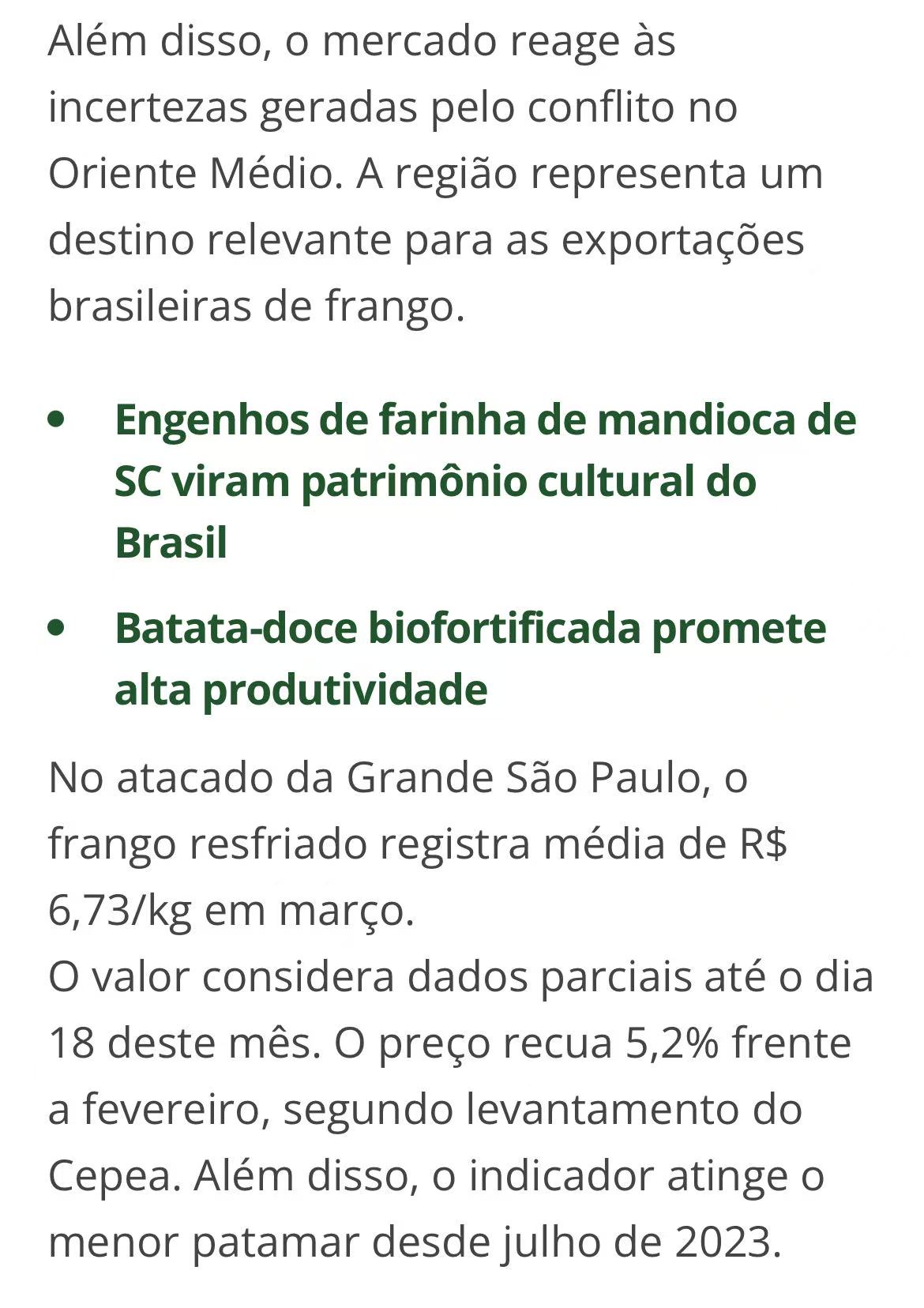 Cepea监测数据显示,3月巴西鸡肉价格持续走低。截至3月18日,大圣保罗批发市场冰鲜鸡均价6.73雷亚尔/公斤,较2月下跌5.2%,为2023年7月以来实际价格最低点。