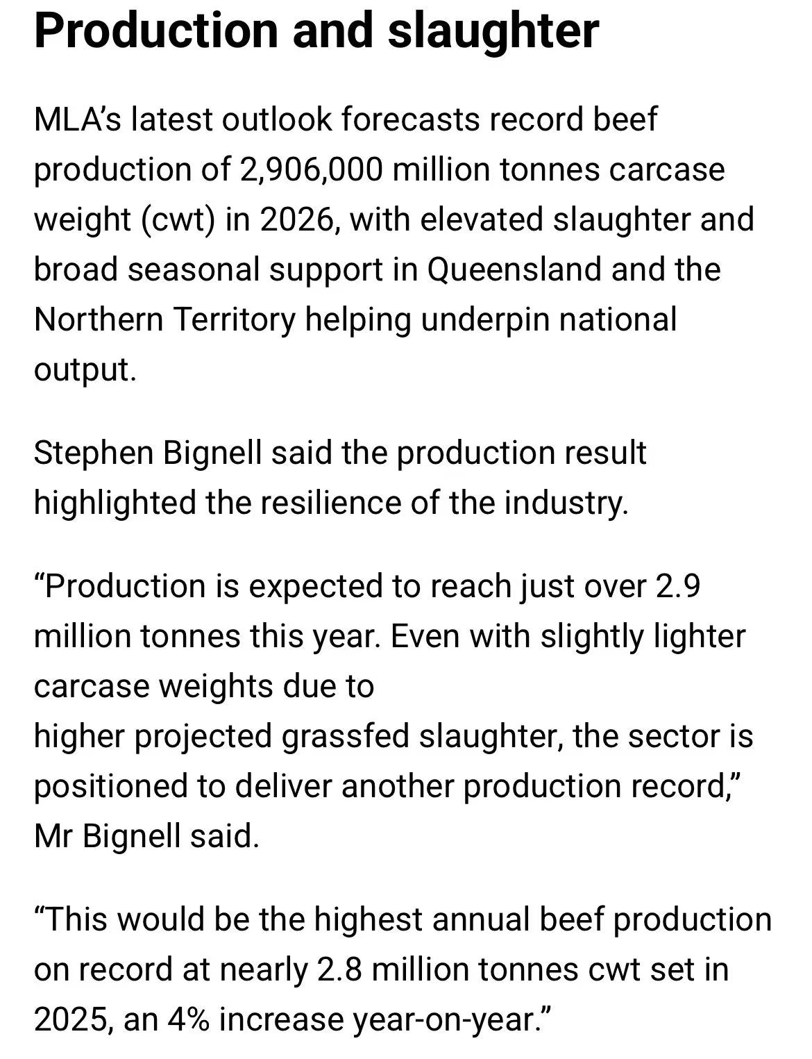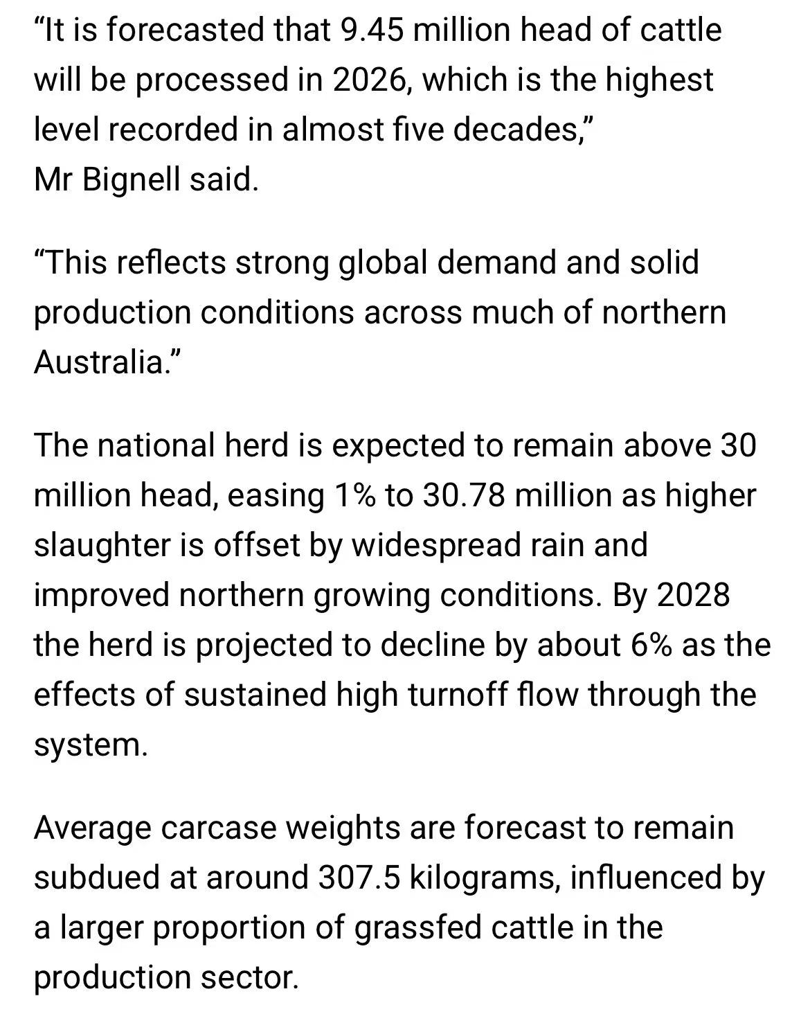 澳大利亚肉类及畜牧业协会(MLA)最新发布的《2026年澳大利亚肉牛行业展望报告》预计,2026年澳大利亚肉牛屠宰量将达到945万头,创下自1978年以来的历史新高。全国牛群规模预计保持在3000万头以上,约为3078万头,较上年微降1%。