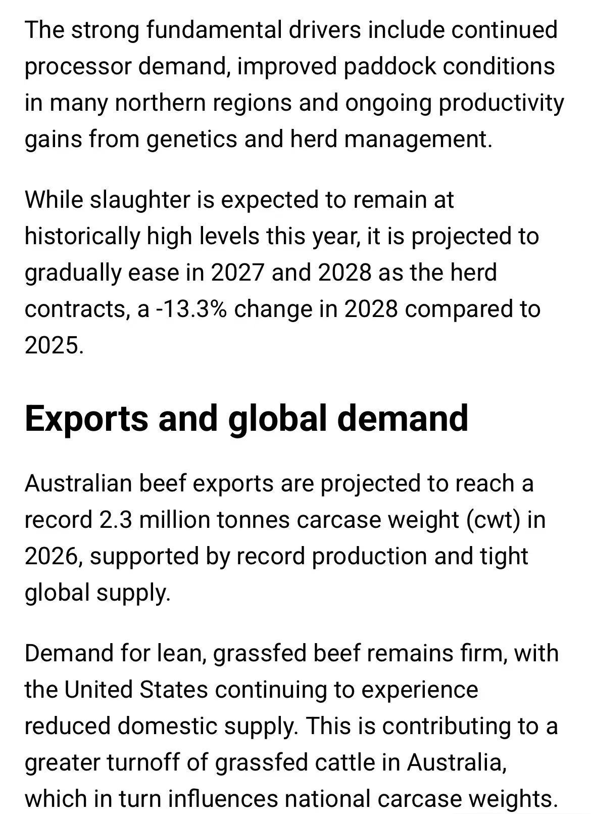 出口方面,在创纪录产量和全球供应趋紧的支撑下,预计2026年澳大利亚牛肉出口量将达到230万吨(胴体重),同样创历史新高。美国国内供应减少持续推动对澳大利亚草饲牛肉的需求。