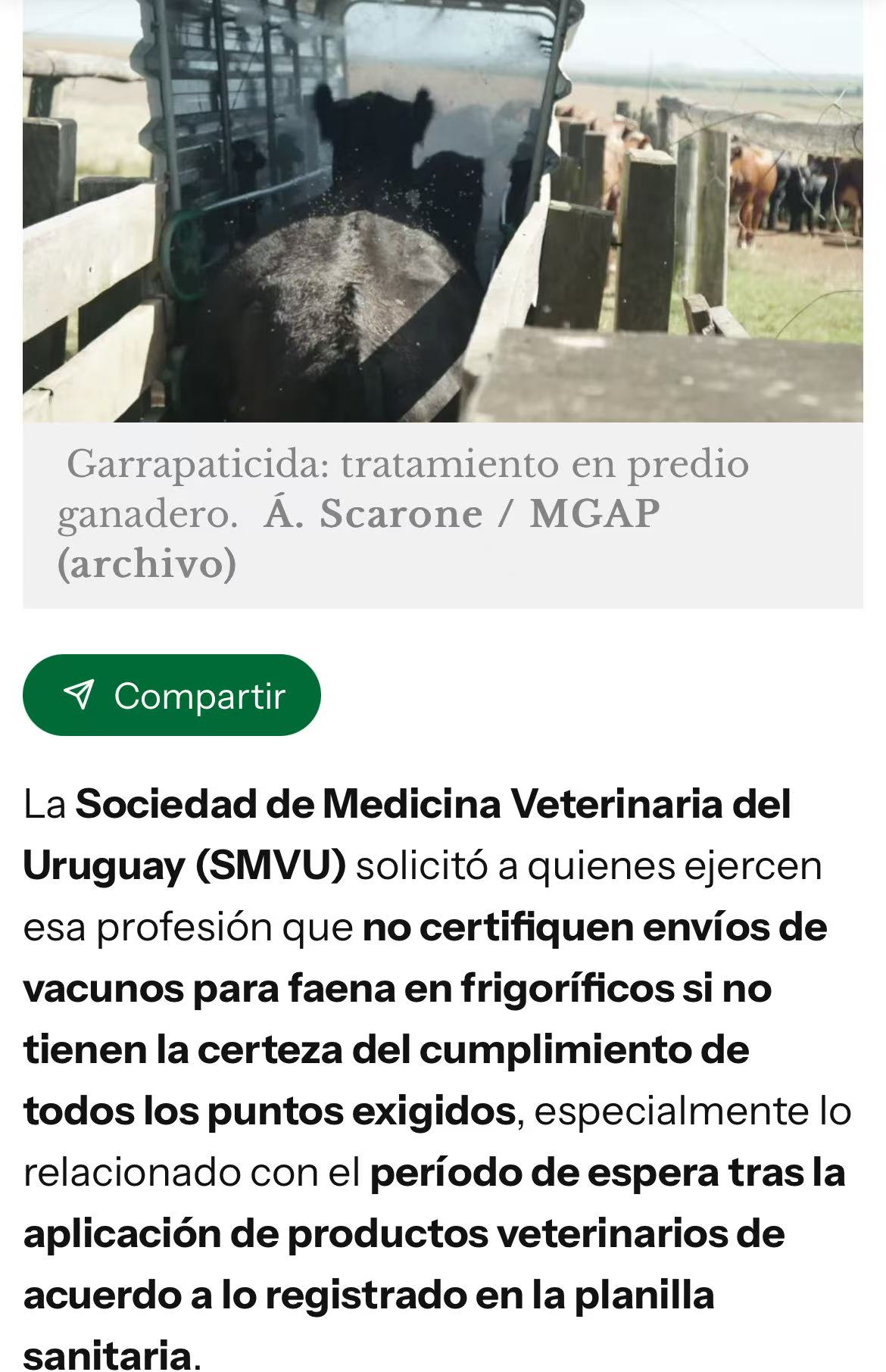 乌拉圭兽医医学会(SMVU)就此发表声明,要求从业兽医在对用于屠宰的牛只出口批次进行认证时,若无法确认所有规定要求均已满足,尤其是动物用药后的休药期是否符合卫生申报表记录,则不得进行认证。