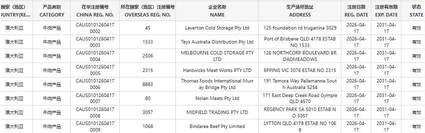 新增澳大利亚8家牛肉企业(注册编码为:45、1533、2506、2315、8883、80、3057、1068)自2026年4月17日(含)后生产的输华产品进口准入。