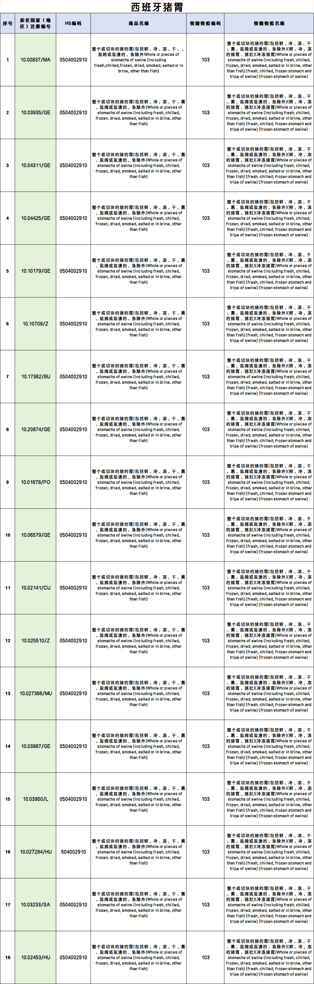 新增18家西班牙工厂输华冷冻猪胃产品(注册编码为:10.00837/MA、10.03935/GE、10.04311/GE、10.04425/GE、10.10179/GE、10.10709/Z、10.17362/BU、10.20874/GE、10.01678/PO、10.06579/GE、10.02141/CU、10.025510/Z、10.027366/MU、10.03987/GE、10.03950/L、10.027284/HU、10.03233/SA、10.02453/HU)自2026年4月17日(含)后生产的输华产品进口准入。