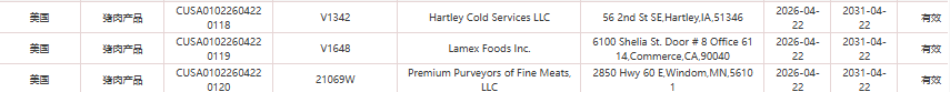 1.新增美国5家猪肉企业(注册编码为:7429、V2988、V1342、V1648、21069W)自2026年4月22日(含)后生产的输华产品进口准入。