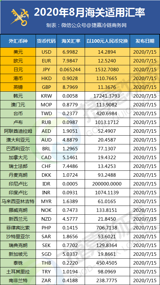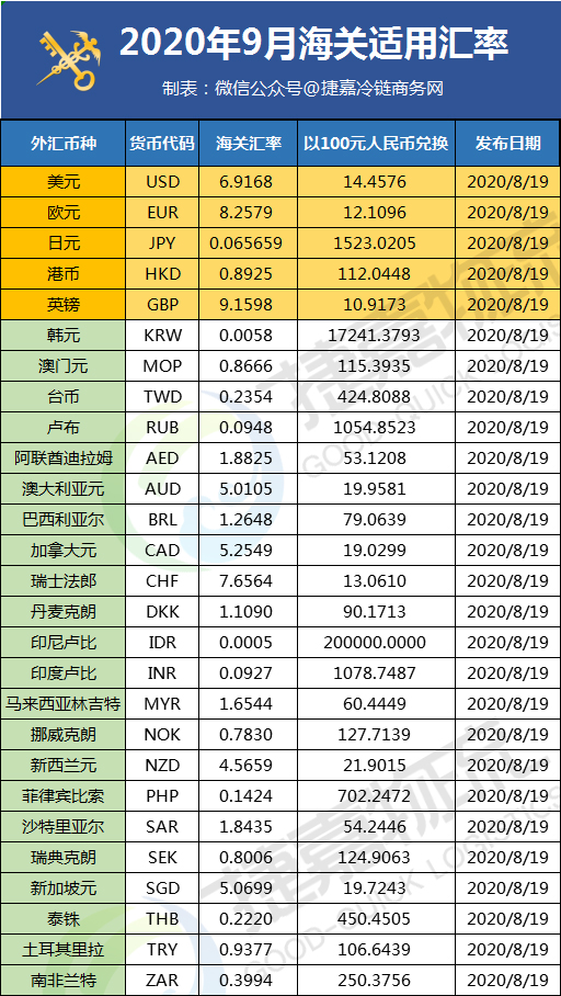 海关汇率 | 2020年9月海关适用汇率(2020年8月19日更新)